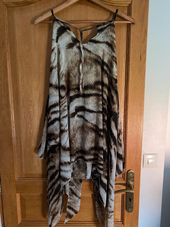 Débardeur tigré, strass au col, à nouer dans le dos au niveau du col Taille; unique (36/38) En très bon état Prix: 4€