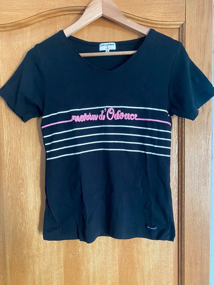 T-shirt manches courtes avec inscription brodée « marin d’odouce » noir Bon état peu porté (les traits blancs ont commencés à se craqueler) Taille: S Prix: 2€