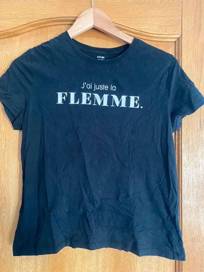 T-shirt manches courtes « j’ai juste la flemme » Noir Kiabi Taille; M Bon état, déjà porté Prix: 1€ Achat en lot uniquement