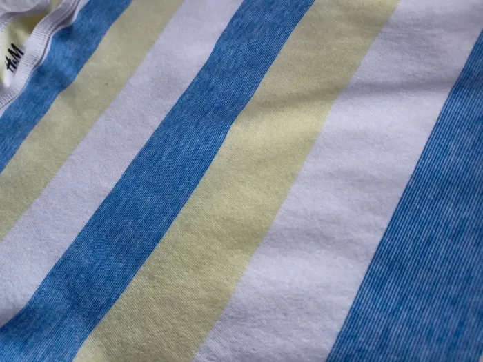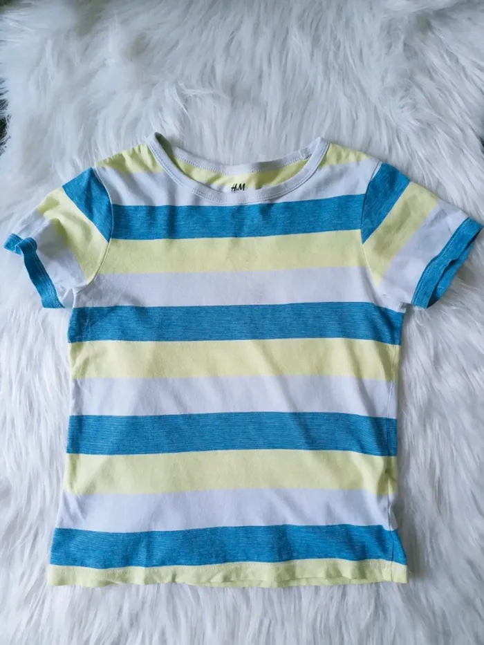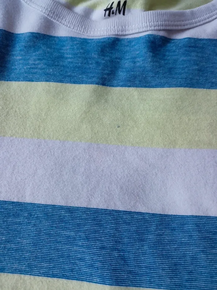 T shirt rayé à manches courtes, taille 6-8ans . Marque H&M. En bon état car petite tâche au devant. Les couleurs on eu du mal à ressortir : rayures marine, vert anis et blanc. N*420 #marynline78enfant #marynline78garcon6ans #marynline78garcon7ans #marynline78garcon8ans