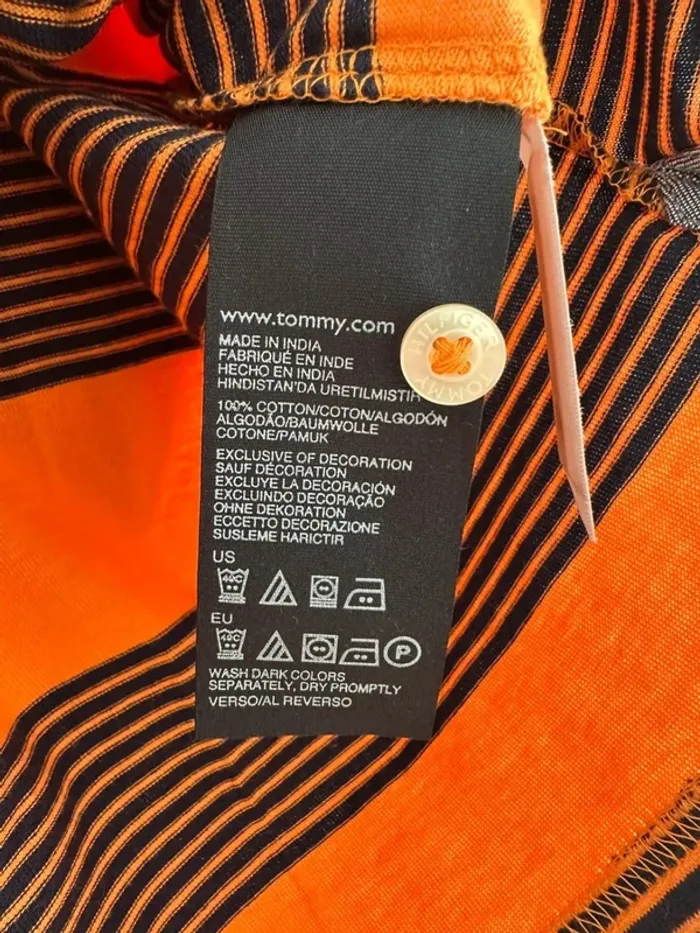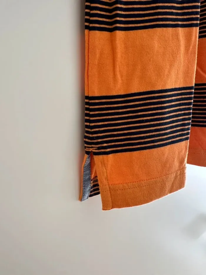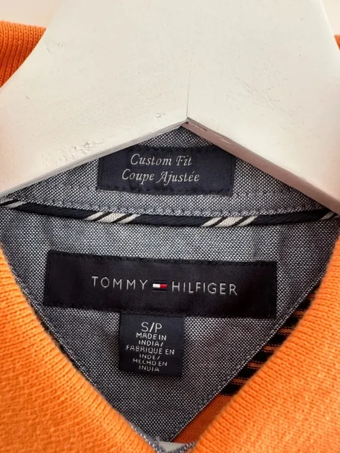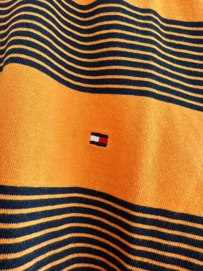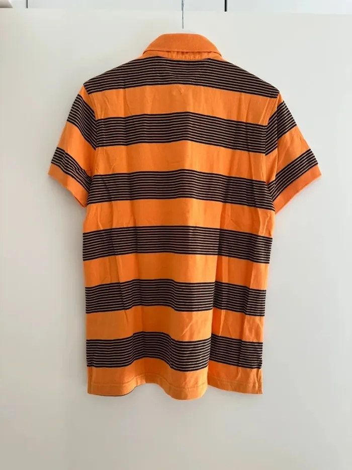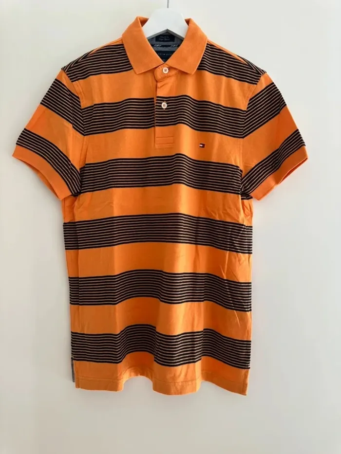Polo homme Tommy Hilfiger original, à rayures noir et orange. Coupe classique avec col, logo discret brodé sur la poitrine. En très bon état, peu porté, aucune tache ni défaut. Parfait pour un look casual chic, été comme hiver sous une veste. Taille : S