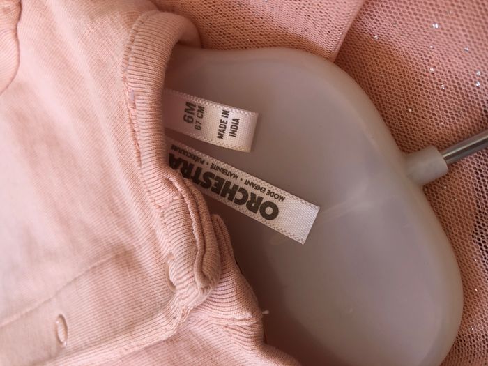 Jolie robe avec body intégré Orchestra, Taille 6 mois/ 67 cm, Mi-saison/ été, En coton/élasthanne et tulle, Manches longues. Robe bi-matière rose pâle/abricot, matière t-shirt, motif cœur à paillettes, inscription « love » sur le haut, et tulle pailleté pour le jupon. Ouverture par pressions en haut du dos et entre les jambes. En très bon état, pas de tache ni de trou. 🌸 Vous aimez cet article ? N’oubliez pas de visiter le reste de mon dressing en filtrant les tailles.