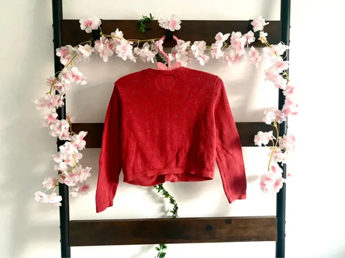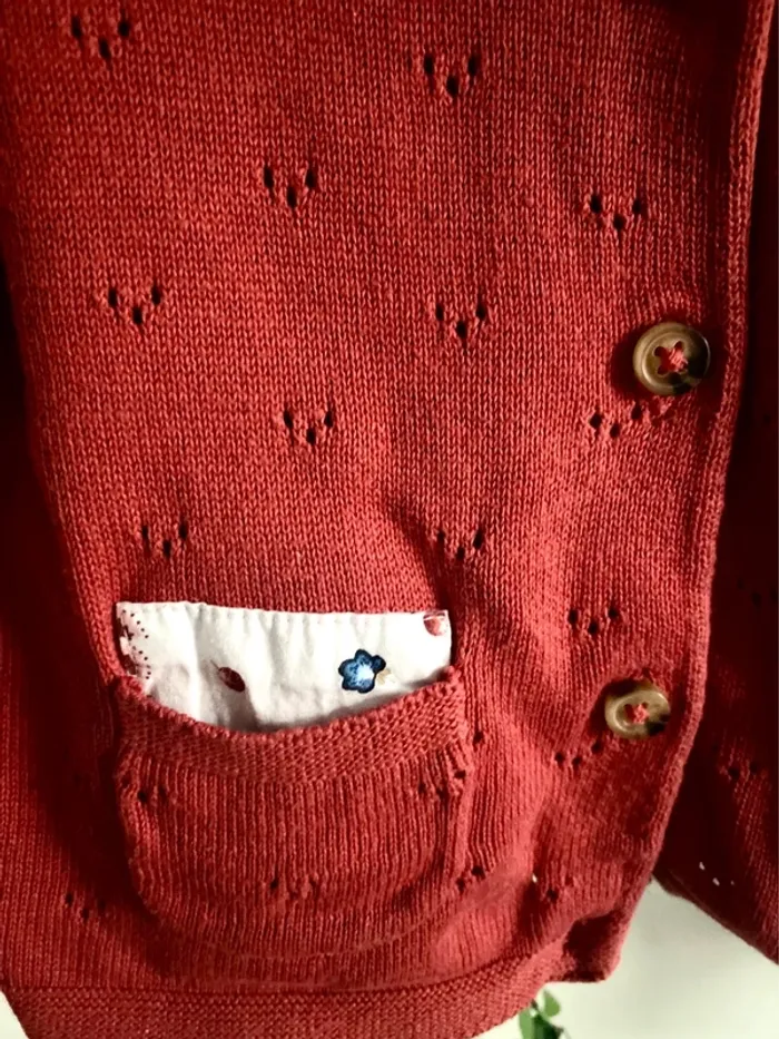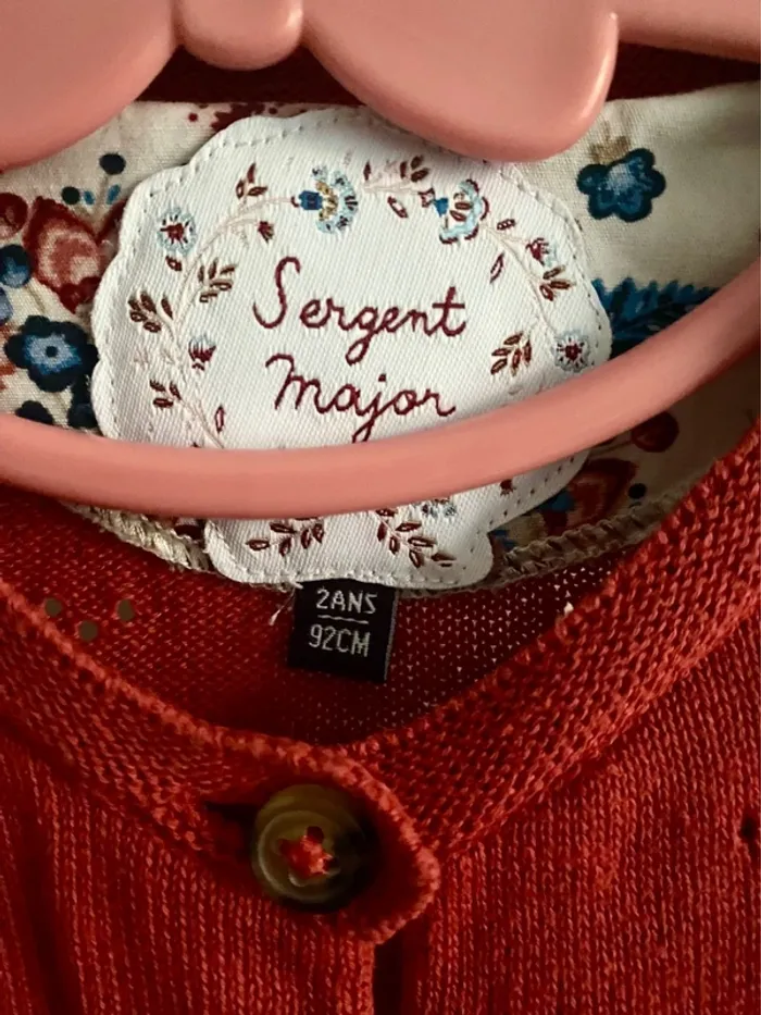 Gilet rouge Avec broderies et poches avec en tissu fleuri Fermeture en boutons Marque Sergent Major Taille 2 ans / 92 cm Neuf très peu porté Idéal mi-saison Vendu 6€ Retrouvez le 2 ans de ma fille via le lien : #2answest_54