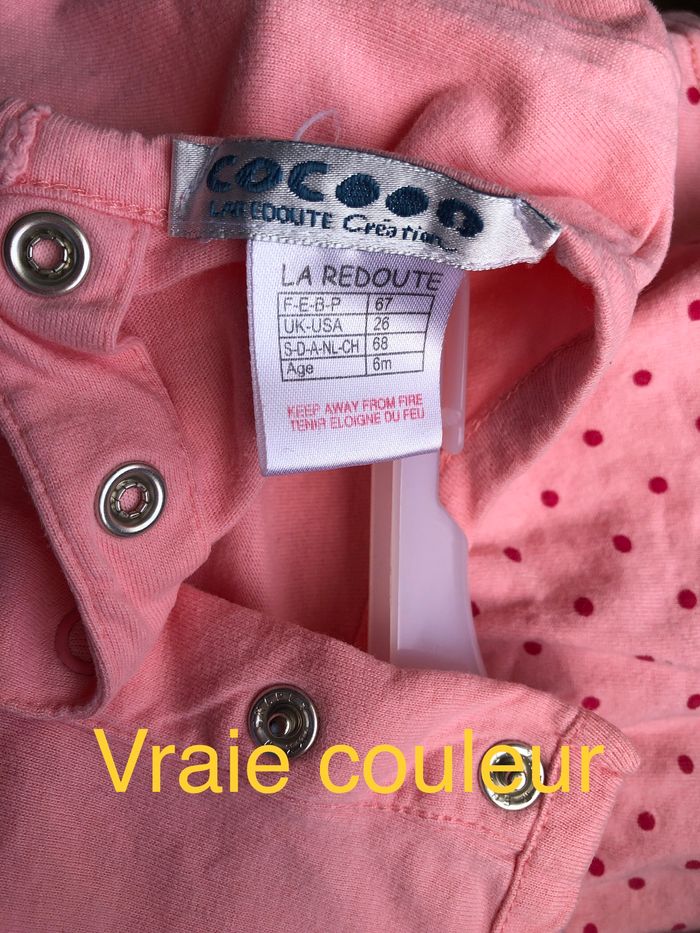 Robe courte/ tunique Cocoon La Redoute, Taille 6 mois/ 67 cm, Manches longues, Mi-saison. Rose avec des points roses plus foncés. Inscription « Baby chérie » noté dans un cœur. Ouverture en haut du dos avec des pressions. En excellent état, sans tache, ni trou. 🌸 Vous aimez cet article ? N’oubliez pas de visiter le reste de mon dressing en filtrant les tailles.