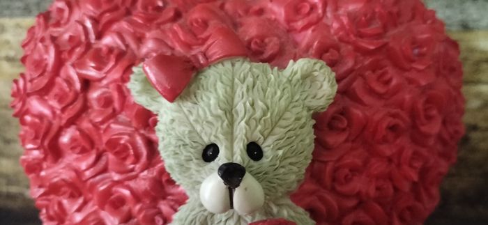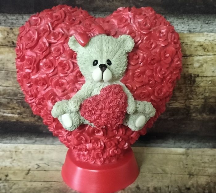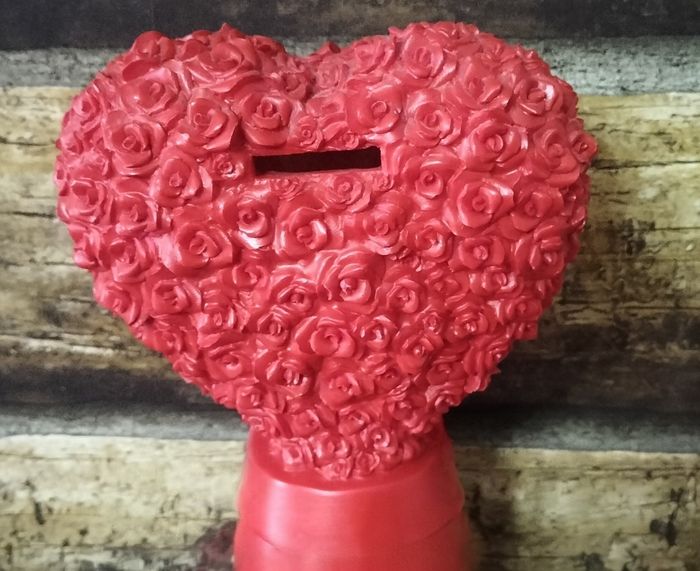 BIEN LIRE L'ANNONCE Tirelire en forme de cœur décoré de roses rouges avec un très joli ours - Très bon état sauf qu'il manque le cache , mais ça ne me dérangeait pas vu que c'était juste pour une déco. - Type de produit : Tirelire - Matière : Autre - Couleur : Rouge - Style : Tirelire - Très bon état 2€50