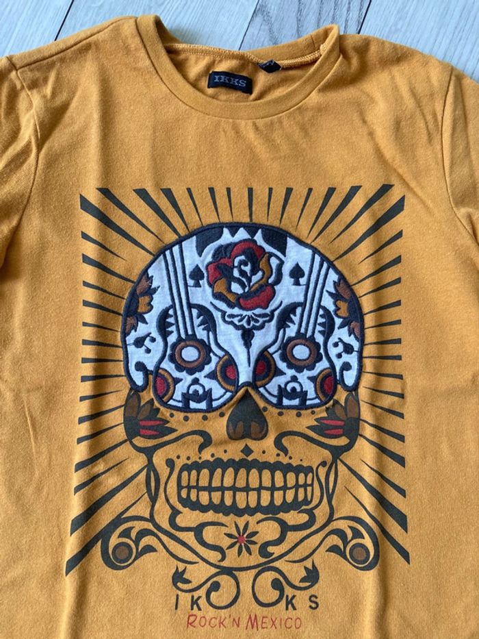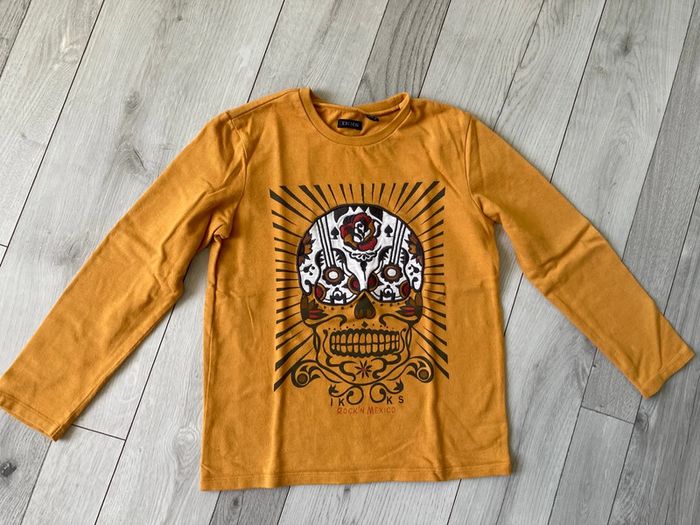 TEE shirt moutarde manches longues motif tête de mort mexicaine taille 8ans excellent état #phelicia21garçon8ans