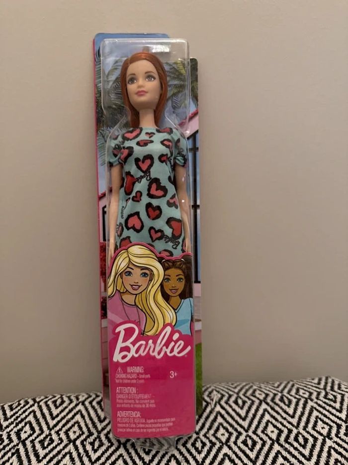 Barbie Chic poupée rousse avec robe bleue à motifs cœurs et chaussures blanches, jouet pour enfant, GHW48