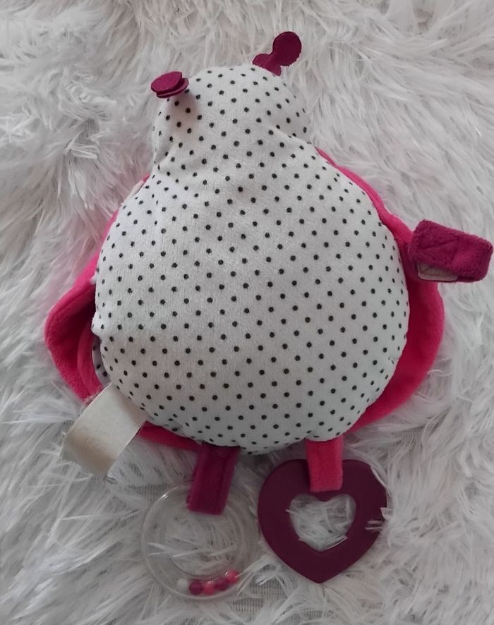 Doudou peluche coccinelle d activités en velours de couleur blanc à pois Ailes sir son dos en velours de couleur rose à gros pois Attaché au bas du doudou un anneau avec petites billes colorées et un anneau de dentition en forme de cœur Attaché tetine Attaché a son aile Miroir sous une aile