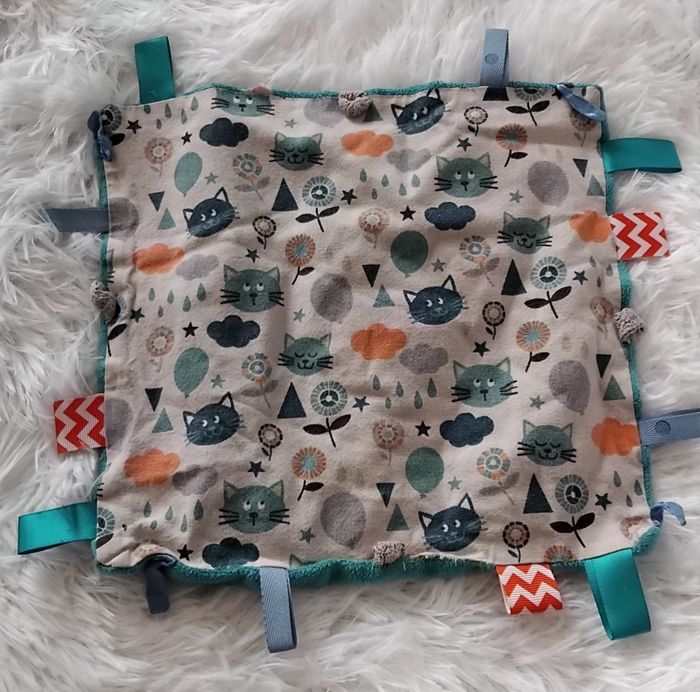 Doudou carré plat en tissus de couleur blanc avec motifs chats,fleurs,nuages,ballons et nuages avec gouttes de pluie Et de l autre côté en velours de couleur turquoise avec reliefs boules Étiquettes autour du doudou
