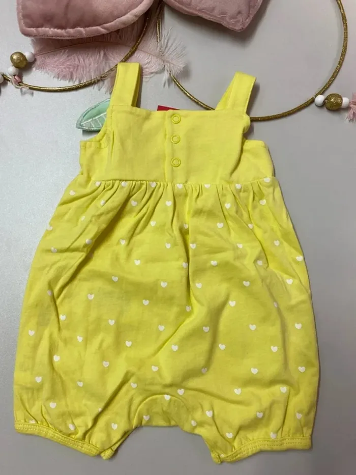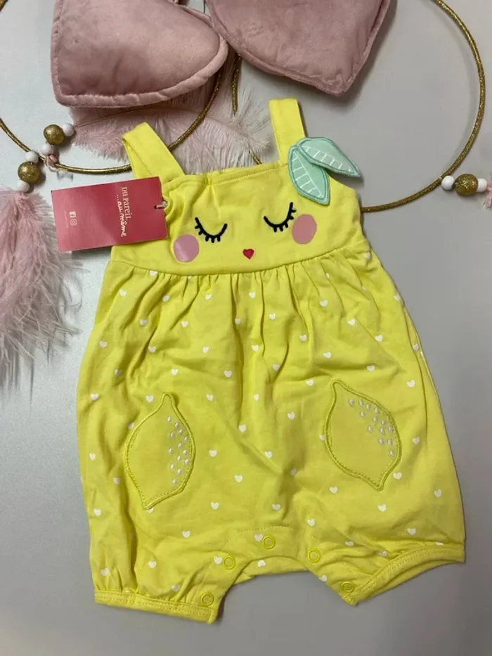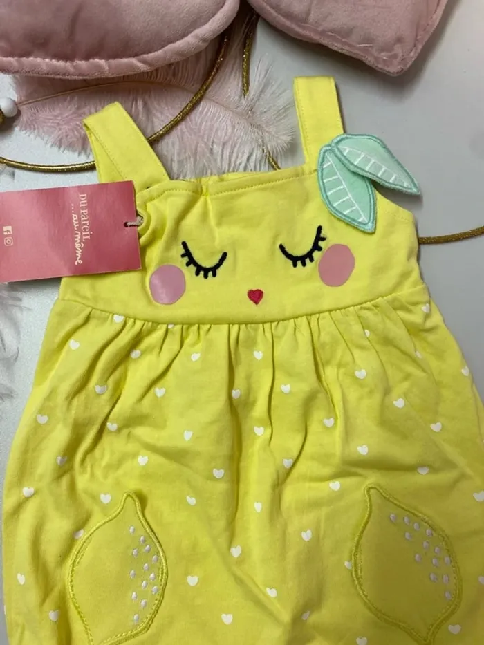 🍋 Barboteuse bébé fille - Du Pareil Au Même (DPAM) 👶 Taille : 1 mois - 53 cm ✨ État : Neuf avec étiquette 👗 Marque : Du Pareil Au Même 💰 Prix : 12,99€ 🌞 Couleur : jaune vif avec petits cœurs 🤍 😊 Motif : visage brodé avec joues roses 💕, petit cœur ❤️ et feuilles 🌿 🍋 Poches en forme de citrons trop mignonnes ! 🔘 Pressions à l’entrejambe pour un habillage facile 💛 Idéal pour l’été : léger, confortable et plein de bonne humeur 🌸🌞 📦 Envoi rapide & soigné ✨ #ferreirasabfille1mois