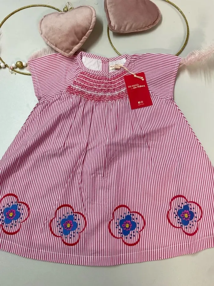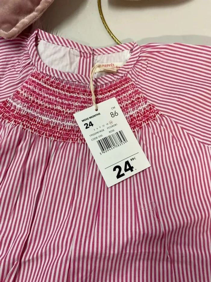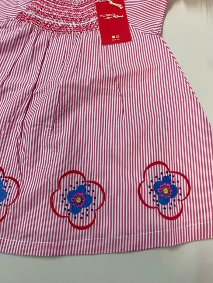 Robe fille Du Pareil au Même – Neuve avec étiquette 🌸 👕 Marque : DPAM (Du Pareil au Même) 🎀 Robe à fines rayures roses et blanches, broderies fleuries colorées en bas. 👧 Taille : 24 mois (86 cm) 🏷️ État : Neuve avec étiquette, jamais portée. 💰 Prix : 24,99€ ✨ Détails : smocks sur la poitrine, coupe ample et confortable. Parfaite pour le printemps et l’été, à porter aussi bien pour une sortie que pour une occasion spéciale #ferreirasabfille24mois