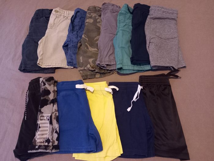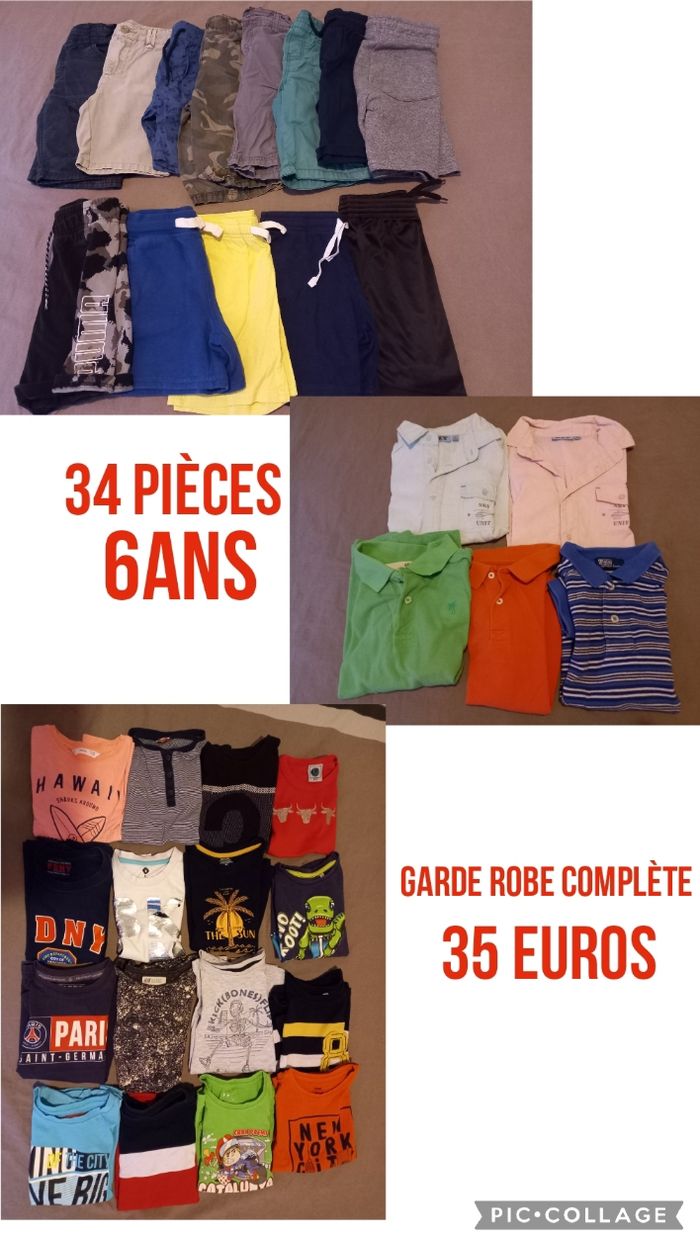Vends garde robe complète été Composée de : 13 shorts/bermudas, dont 1 catimini, 1 cyrillus et 1 puma. 2 chemises manches courtes 3 polos MC , dont 1 Ralph lauren 16 t shirt Tout en bon à très bon etat Tout en taille 6ans. Donne 5 t-shirt en plus, flocage légèrement craquelé. Maison non fumeur et sans animaux
