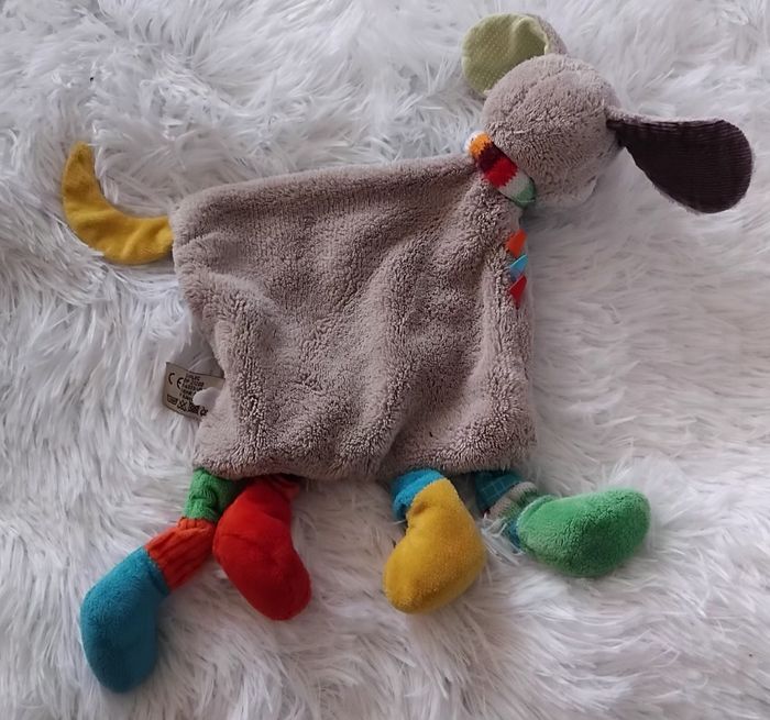 Doudou plat chien en velours de couleur gris et sur le haut en velours de couleur bleu turquoise Cercles sur le doudou Écharpe en laine rayée multicolores autour de son cou Pattes multicolores sur le bas du doudou Queue en velours de couleur jaune