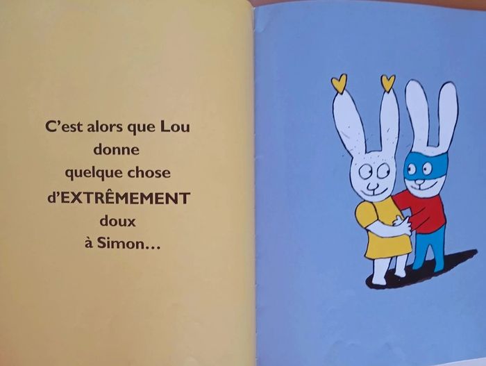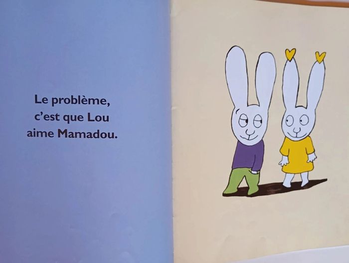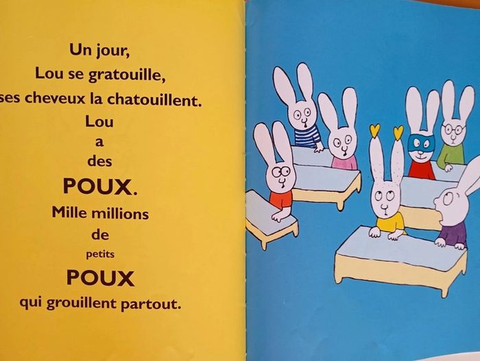 Simon aime Lou. Il en est fou. Hélas, Lou aime Mamadou. Alors Simon est jaloux. Mais voilà qu’un jour, Lou attrape des poux. Ça la chatouille, ça la gratouille. Cet idiot de Mamadou n’a que des moqueries à la bouche : « Lou, tête à poux ! » Heureusement que Simon, lui, est beaucoup plus gentil ! Lou, il la console et la cajole. Il la rassure : « Un peu d’anti-poux, et tu n’en auras plus du tout ! » Devant tant de délicatesse, Lou donne à Simon… un bisou… mais ce n’est pas tout ! Editeur : Ecole des Loisirs 40 pages Dimensions : 22 x 27 cm Âge : 3 - 6 ans Livre en très bon état (Légères traces de manipulation) Je vends d'autres livres de l'école des loisirs #phil_peg_écoledesloisirs ou de Stephanie Blake #phil_peg_stephanieblake, #phil_peg_simon #écoledesloisirs #simon #amour #école #entraide #lapin #poux