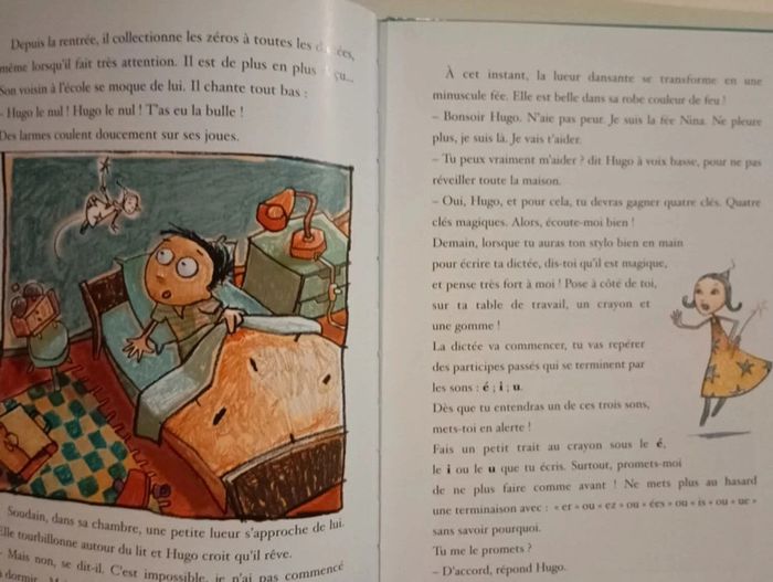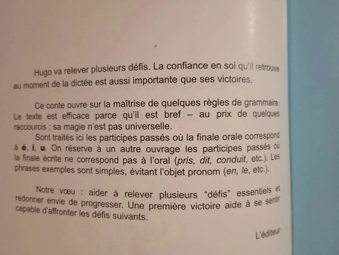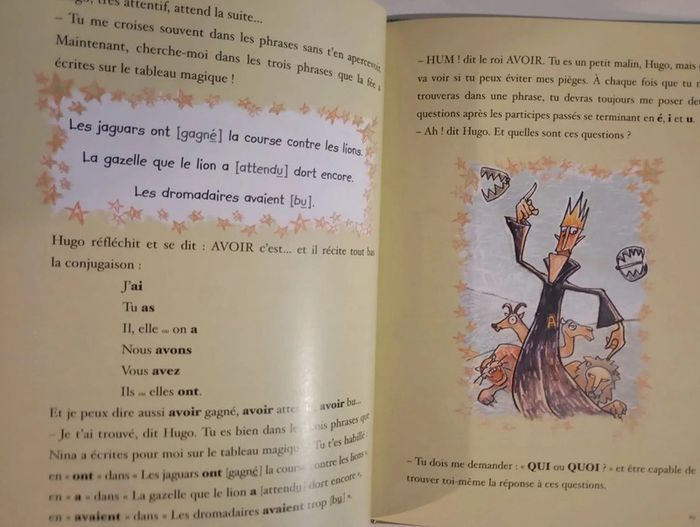 ou comment accorder les participes passés sans se tromper. Comment maîtriser les règles complexes d'accord des participes passés ? Voici un conte grammatical illustré pour ne plus faire de fautes. Le 1er tome de la méthode révolutionnaire d'Anne-Marie Gaignard, Hugo et les rois, qui a déjà conquis plus de 500 000 lecteurs.C'est l'histoire d'une victoire heureuse et définitive. Les règles de l'accord du participe passé sont compliquées, mais Hugo apprend à les maîtriser. Une fée lui explique tout, avec des mots de tous les jours, et des dessins. Il s'en souviendra toute sa vie.... Editeur : Le Robert 48 pages Dimensions : 19 x 24 cm Livre NEUF Je vends un autre livre de la même collection #phil_peg_hugo #grammaire #participespassés