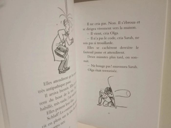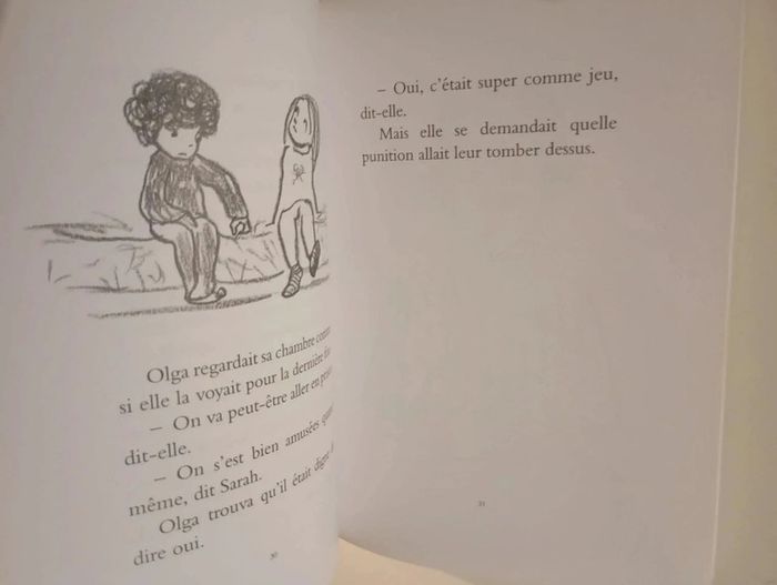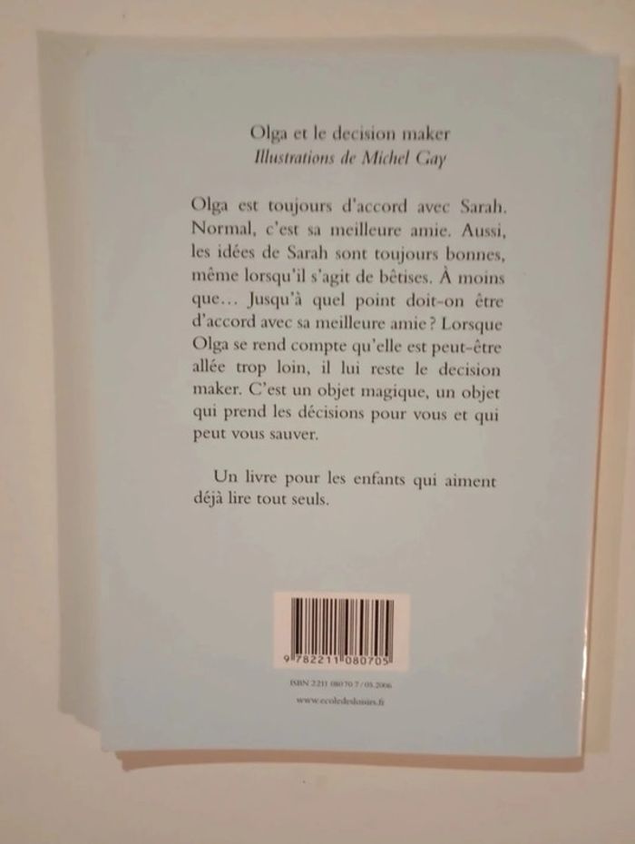 Olga est toujours d’accord avec Sarah. Normal, c’est sa meilleure amie. Aussi, les idées de Sarah sont toujours bonnes, même lorsqu’il s’agit de bêtises. À moins que… Jusqu’à quel point doit-on être d’accord avec sa meilleure amie ? Lorsque Olga se rend compte qu’elle est peut-être allée trop loin, il lui reste le "decision maker". C’est un objet magique, un objet qui prend les décisions pour vous et qui peut vous sauver. Editeur : Ecole des Loisirs 68 pages Dimensions : 19 x 13 cm Âge : 6 -8 ans Livre en très bon état Je vends d'autres livres de l'école des loisirs #phil_peg_écoledesloisirs et d'Olga #phil_peg_olga #écoledesloisirs