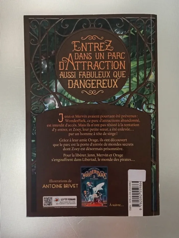 Entrez dans un parc d'attraction aussi fabuleux que dangereux. Jenn et Mervin avaient pourtant été prévenus : WonderPark, ce parc d'attractions abandonné, est interdit d'accès. Mais ils n'ont pas résisté à la tentation d'y entrer, et Zoey, leur petite sœur, a été enlevée... par un homme à tête de singe ! Grâce à leur amie Orage, ils ont découvert que le parc est la porte d'entrée de mondes secrets dont Zoey est désormais prisonnière. Pour la libérer, Jenn, Mervin et Orage s'engouffrent dans Libertad, le monde des pirates... Éditeur ‏ : ‎ Pocket Jeunesse 144 pages Âge de lecture ‏ : ‎ 9 - 12 ans Dimensions ‏ : ‎ 11 x 0.8 x 17.9 cm Livre en très bon état #parcdattraction