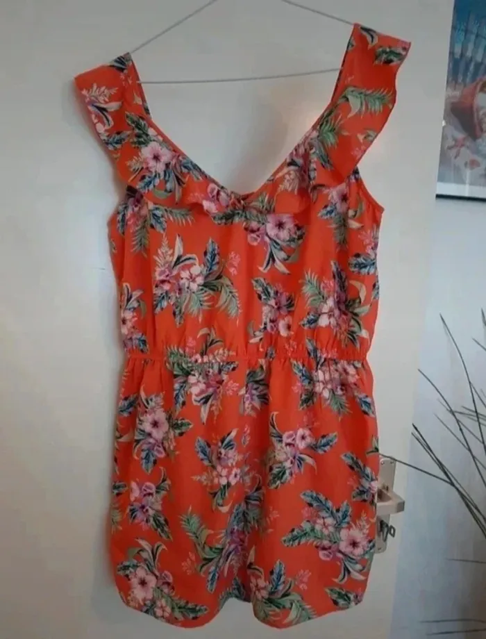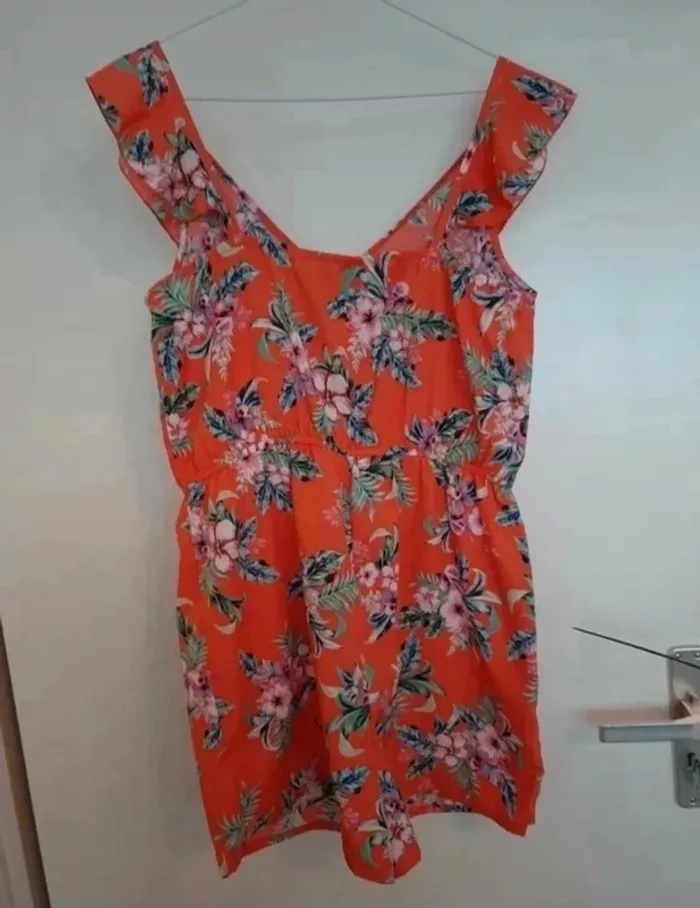 Jolie combishort en matière légère. Décolleté, froufrou sur les bretelles. Elastique à la taille. Pas de poches. Primark, jamais portée, taille L, très bon état. Elle est super mignonne. Je la vends au prix de 10 euros. #TailleL40marine