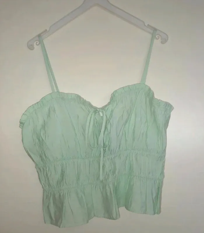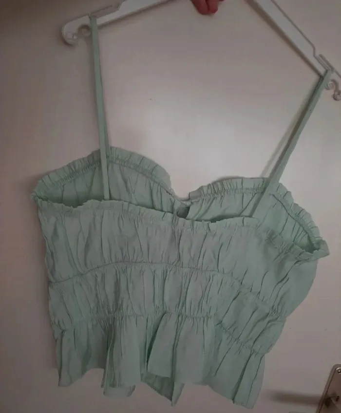 Super joli crop top vert d'eau/menthe mais la couleur ne ressort pas sur les photos :( Taille 42, Primark neuf. J'avais juste raccourcis les bretelles qui étaient très longues mais il suffit de couper les points si ça ne vois va pas. Je ne l'ai pas porté. Je le vends au prix de 7 euros. #TailleXL42marine