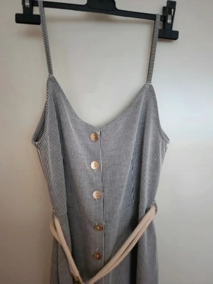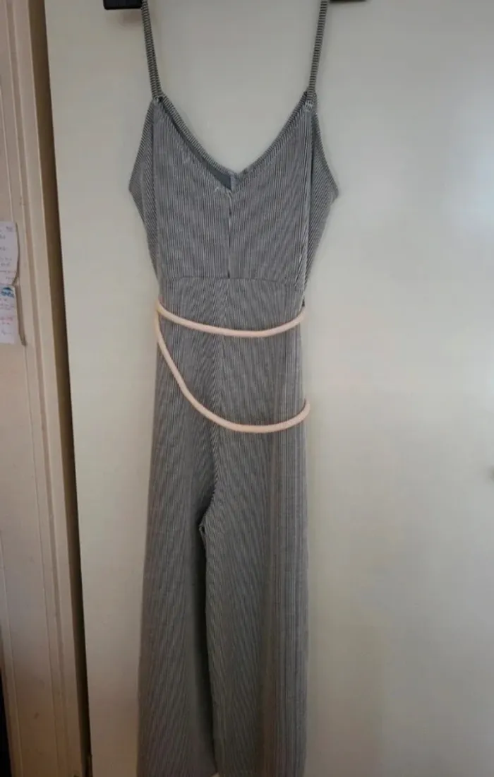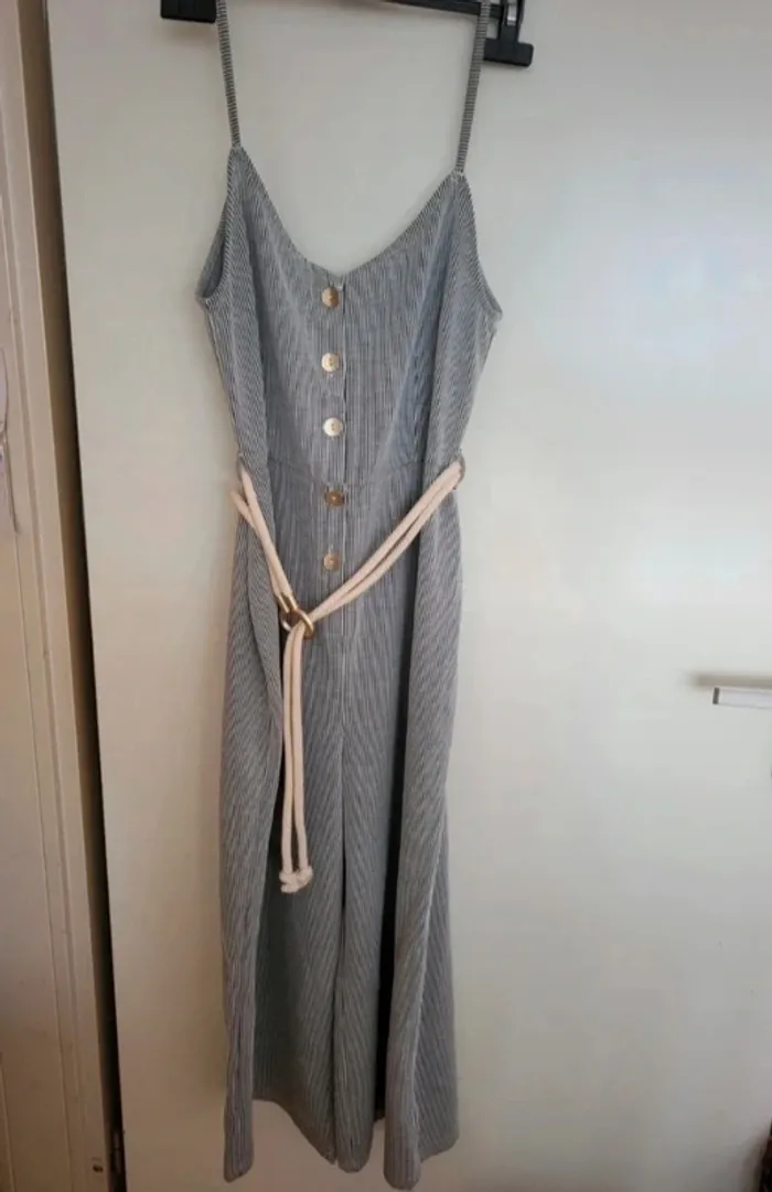 Combinaison lignée. Cordon comme ceinture. Bretelles et jambes larges. Primark taille 40. Je ne pense pas portée, ou max 1 fois. Je la vends au prix de 15 euros. #TailleL40marine