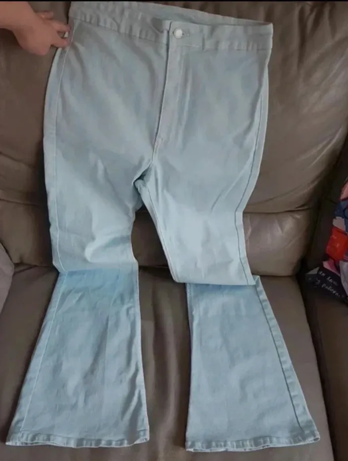 Jean taille haute marque Bershka. Pattes d'éléphant. Étiquette coupée mais taille L. Excellent état. Bleu très clair. Je le vends au prix de 12 euros. #TailleL40marine