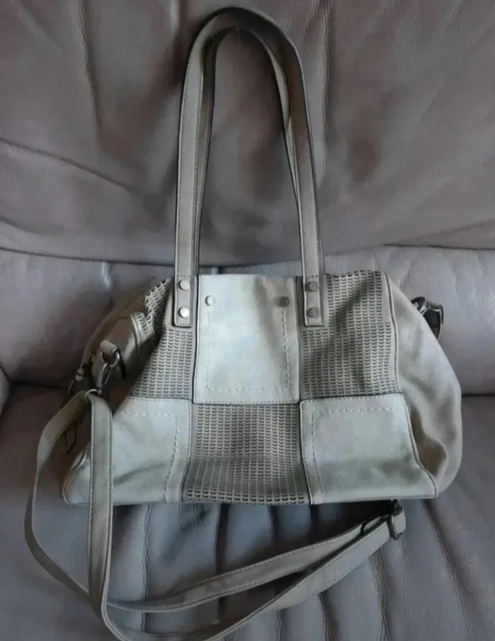 Beau sac dans les tons verts, porté à l'épaule ou en bandoulière (détachable). Poches intérieures et une derrière. Très bon état. +- 14cm x 32cm x 25cm. Je le vends au prix de 15 euros. #Sacsmarine