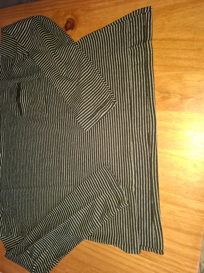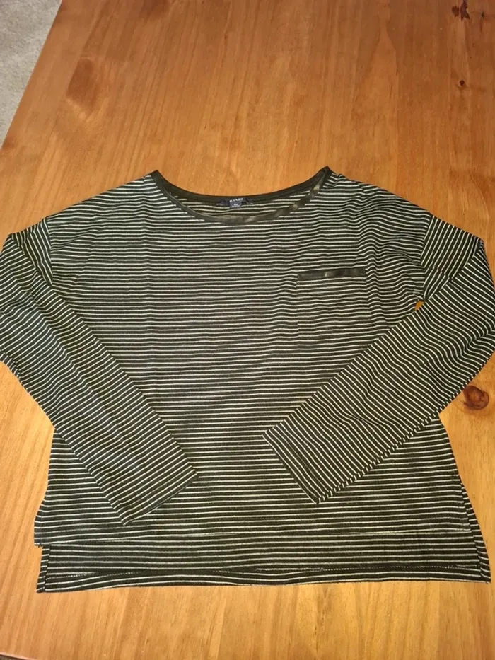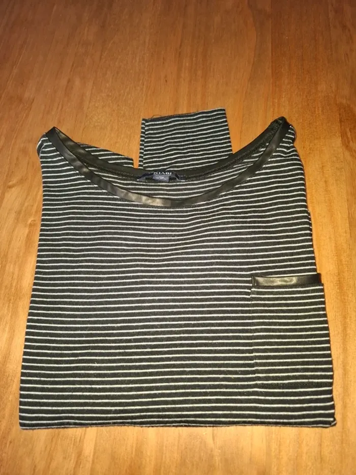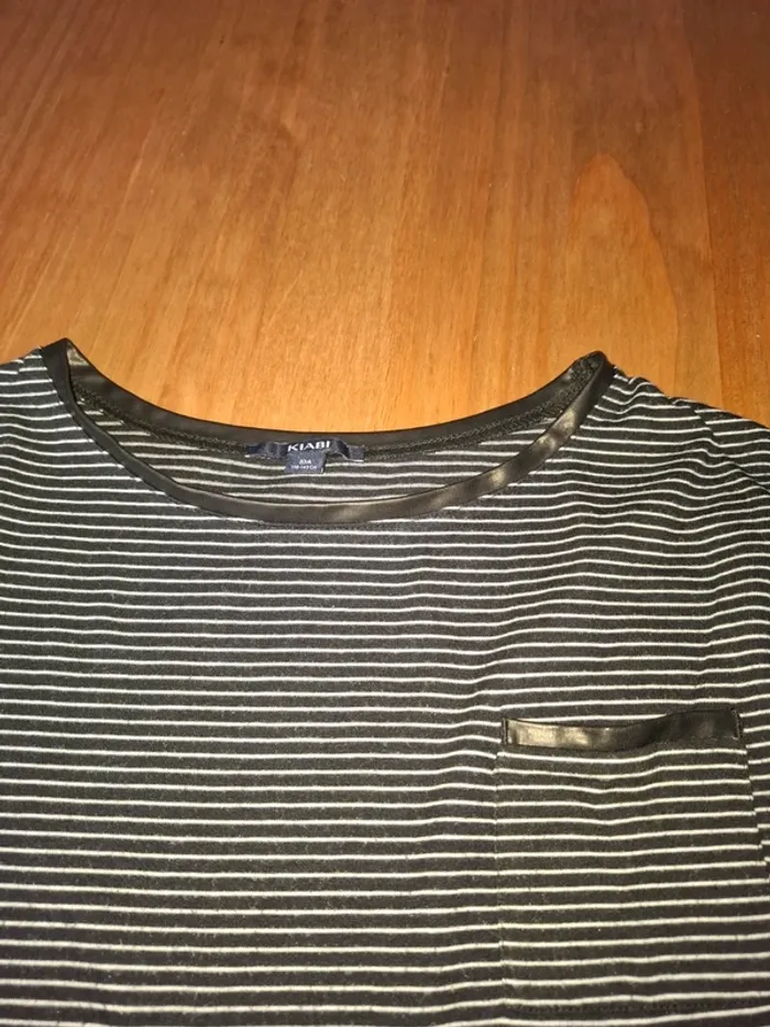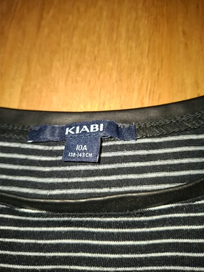 T-shirt manches longues ou pull fin en parfait état rayures verticales noires et blanches. Coupe large plus long derrière que devant. Encolure et petite poche avec biais en simili-cuir. Taille 10 ans marque Kiabi #10anssevy57