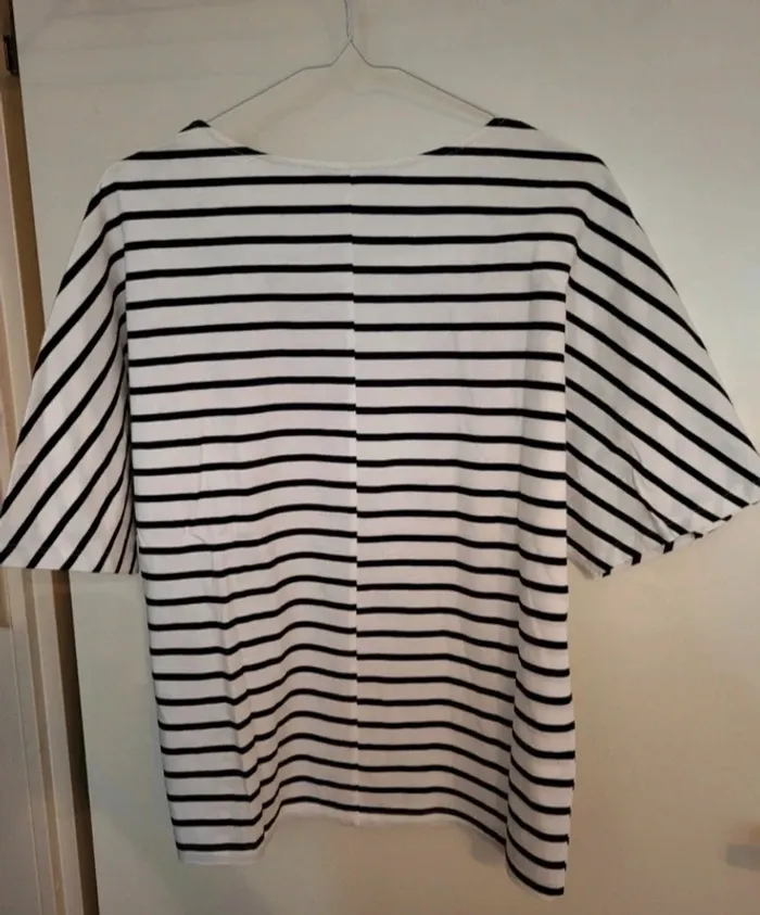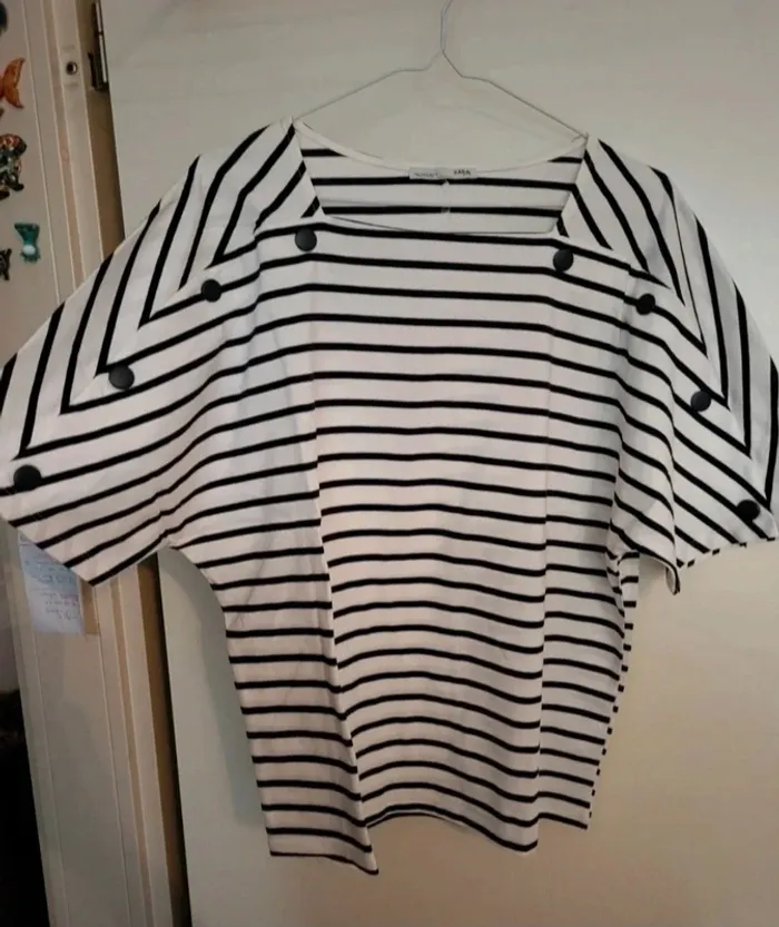 Blouse/t-shirt manches chauve-souris noir et blanc, marinière avec faux boutons. Zara, correspond à du S. Excellent état. 100% cotton. Je le vends au prix de 13 euros. #TailleS36marine
