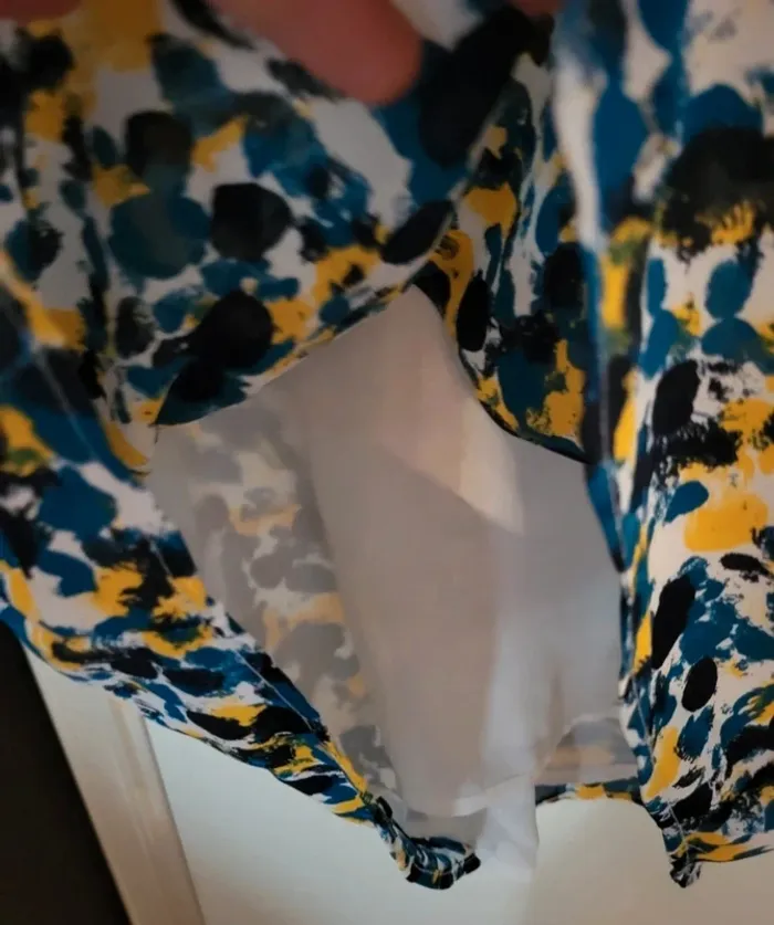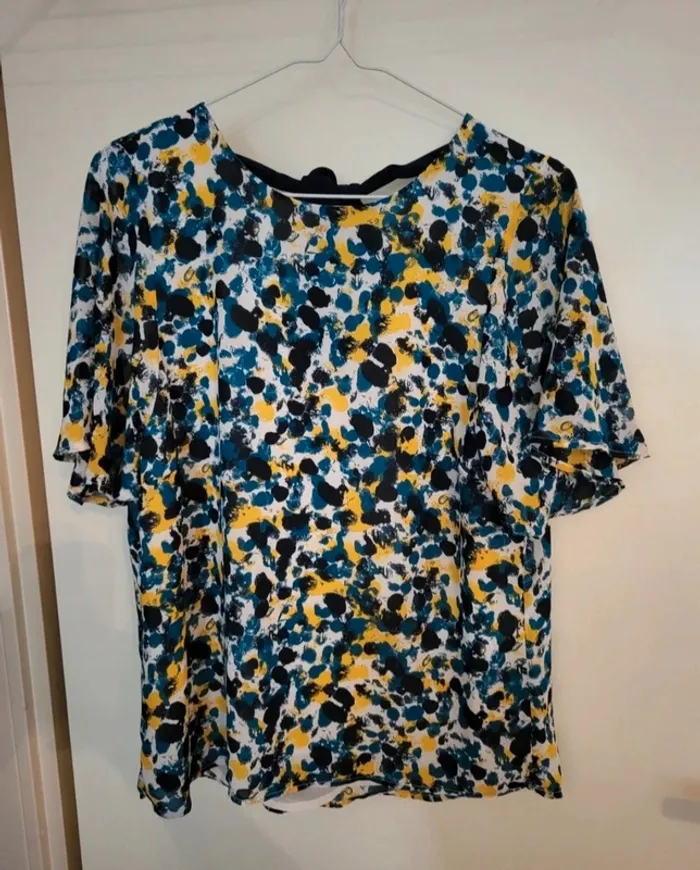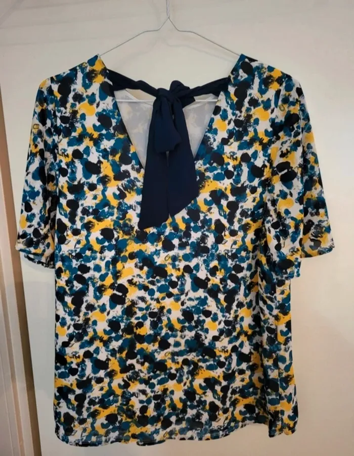 Superbe blouse manches courtes et voilées. Ample, V dans le dos avec noeud pour attacher. Blanc, jaune, bleu et noir. H&M taille 38. Excellent état. Je la vends au prix de 12 euros. #TailleM38marine