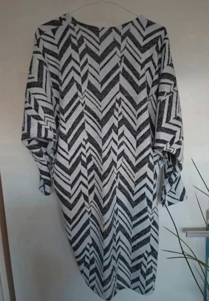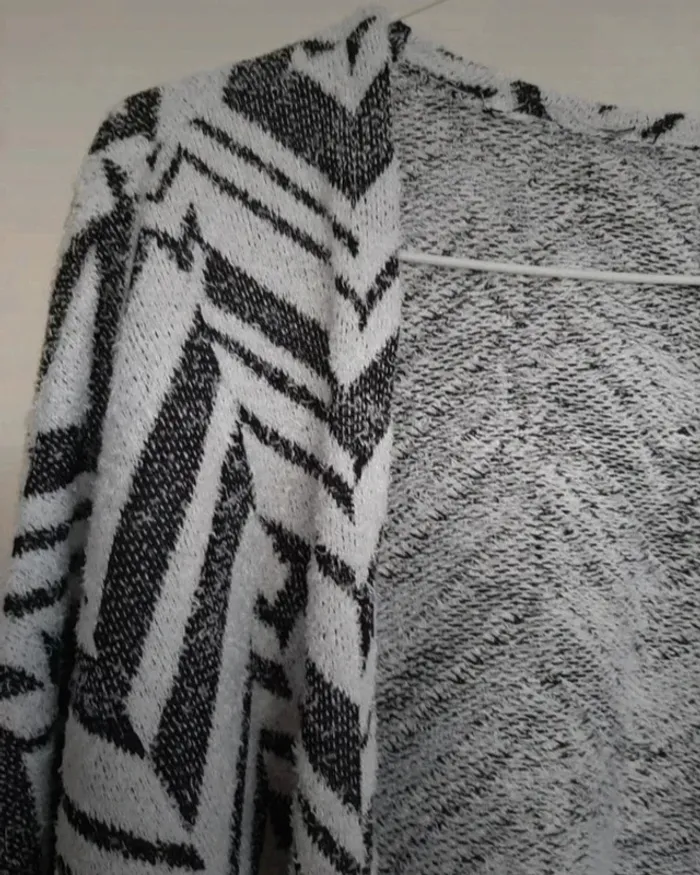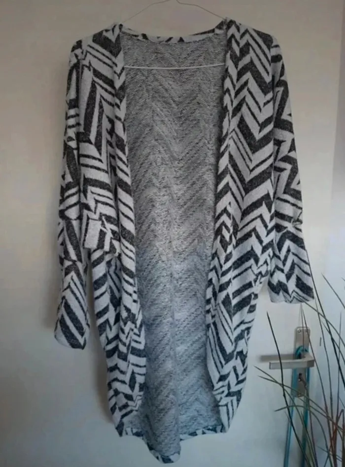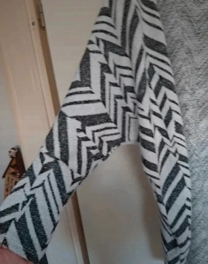 Long gilet avec manches 3/4 et chauve-souris. Matière agréable. Taille unique. Motifs géométriques. Noir et blanc/gris. Peut-être porté 1 fois mais pas certaine. Je le vends au prix de 12 euros. #TailleUniquemarine