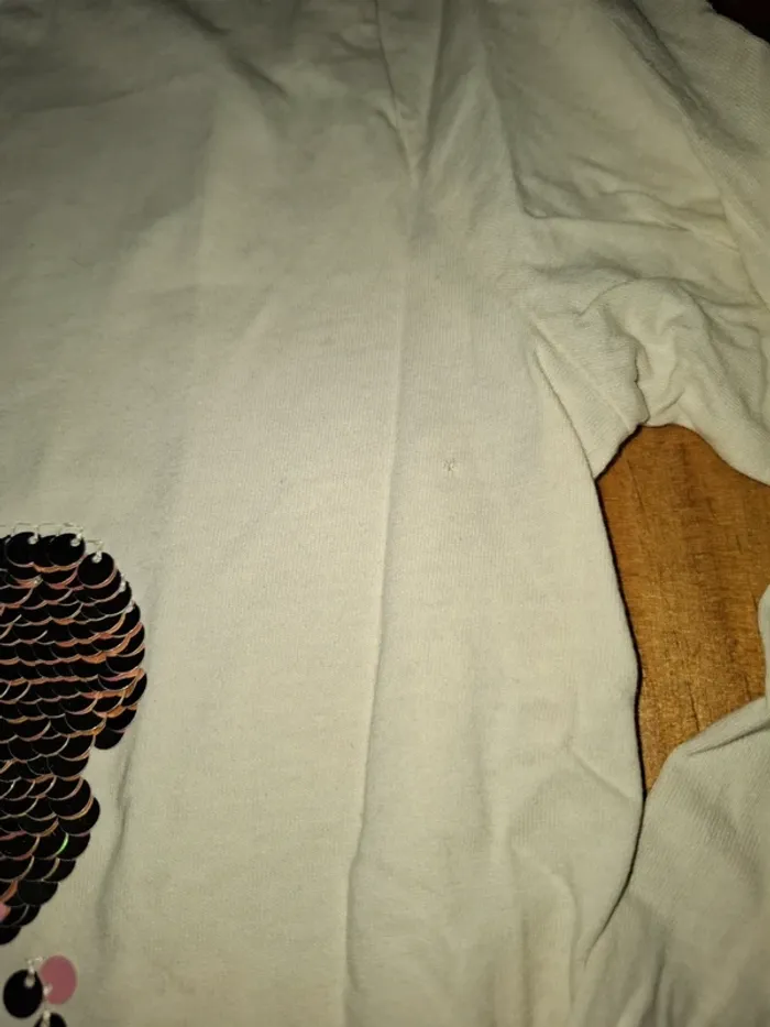 T-shirt beige avec motif en sequins de couleur changeante. En TBE général 1 petit trou (réparable) voir photo Taille 10 ans marque C&A #10anssevy57