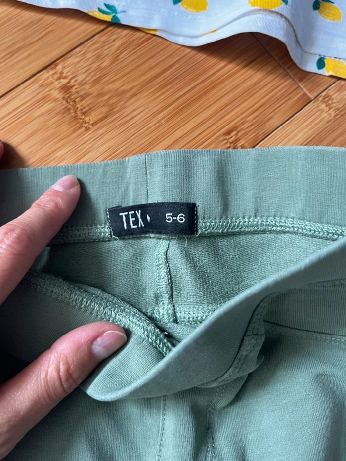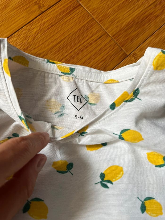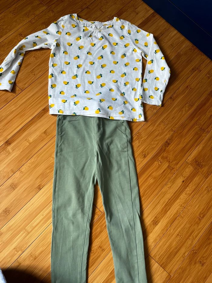 Ensemble, composé d’un T-shirt blanc avec des petits citrons et un pantalon vert, marque tex, taille 5/6 ans, l’ensemble en très très bon état