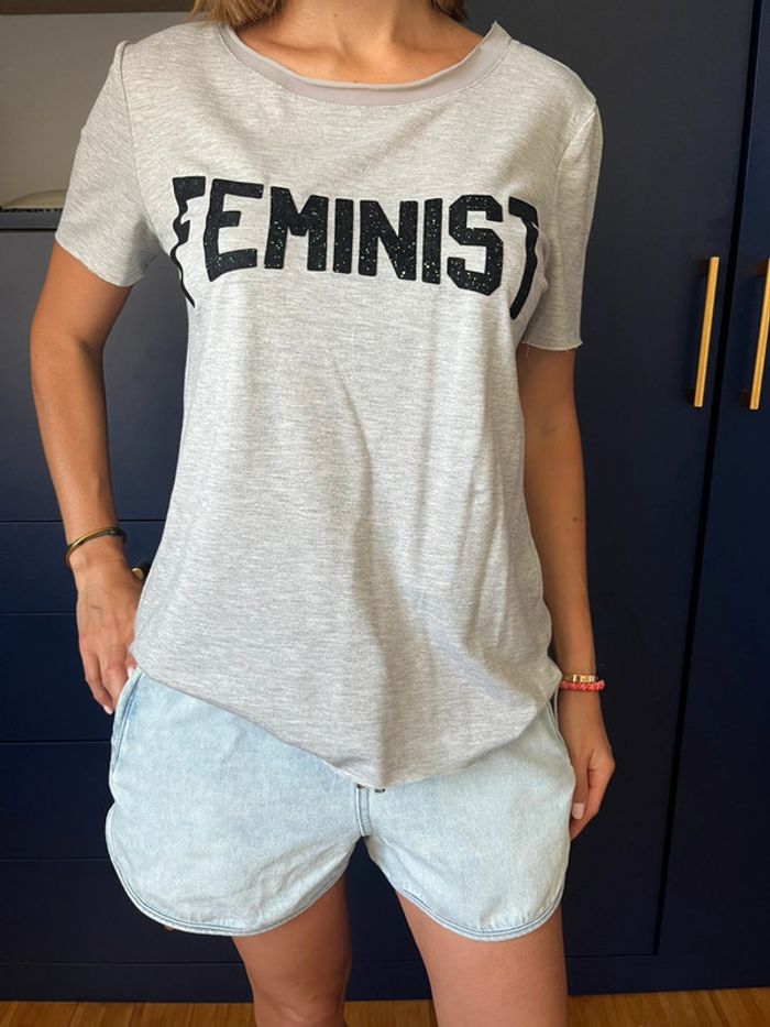 T-shirt gris avec inscription « féminist »  en velours noir À paillettes taille S en très bon état.