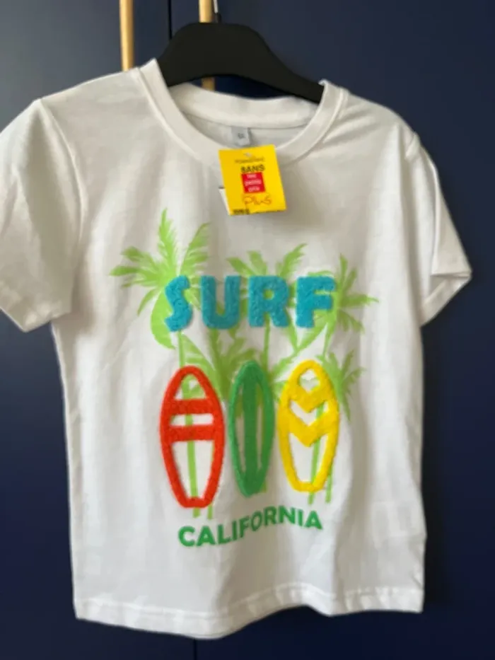 Lot comprenant un short en coton, kaki, taille six ans, neuf avec étiquette et un T-shirt blanc broderie Surf, taille six ans, neuf avec étiquette