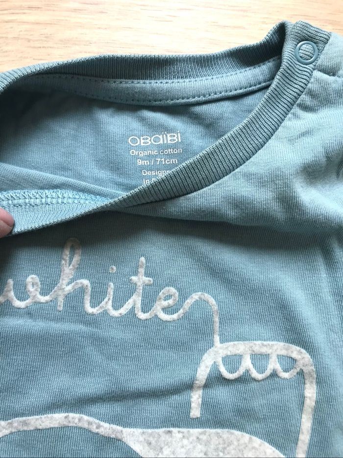 Tee shirt manches longues 9M obaibi bleu éléphant Une des manches est légèrement tachée et le motif en feutrine attrape les fibres au fil des lavages.