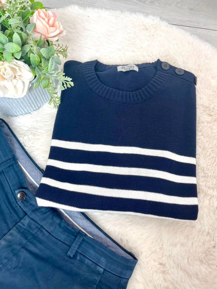 Prix du pull neuf : 130€ ,Pull col rond à boutons, reçu comme cadeau et jamais porté donc état neuf. Composé de laine mérinos. Idée cadeau fête des pères, à offrir,possibilité d’emballage cadeau 🎁 🎉🥳