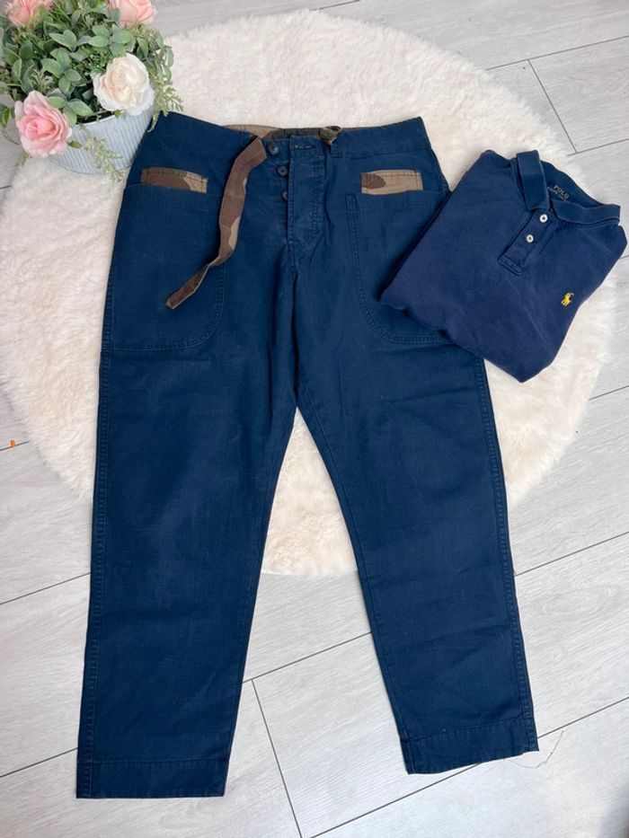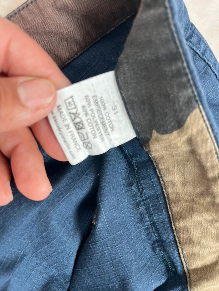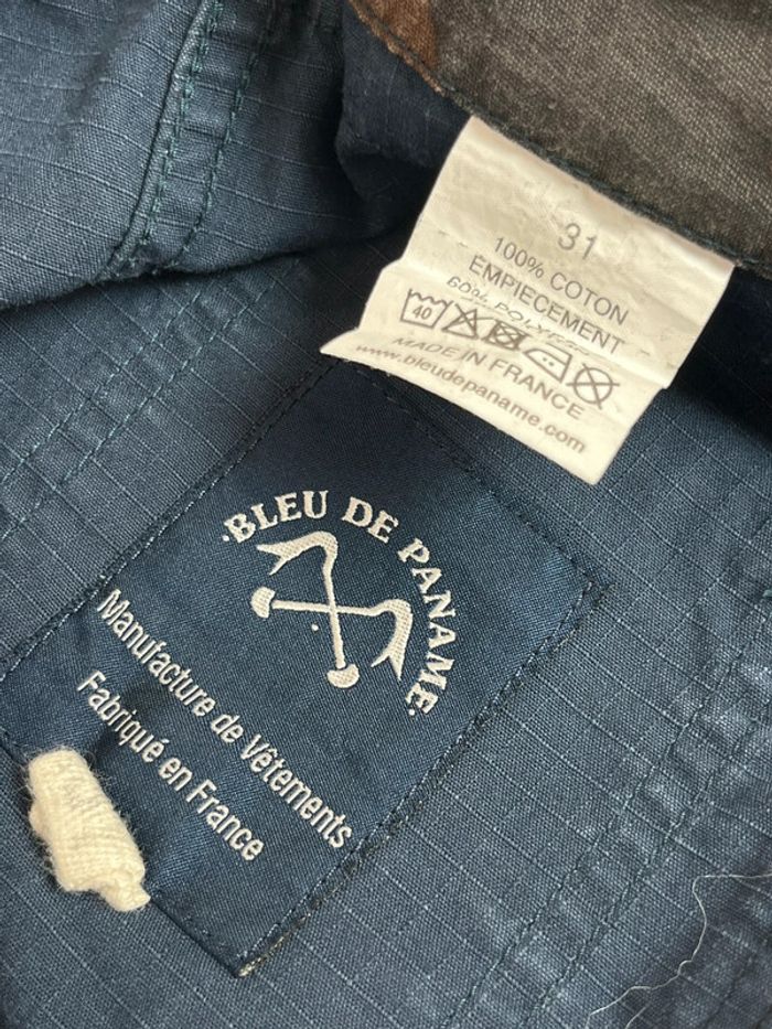BLEU DE PANAME Pant de Chauffe Marine. Pantalon de chauffe confectionné en coton ripstop. Ceinture ajustable à la taille. Quatre grandes poches à l'avant et à l'arrière. Coupe relax resserrée sur le bas. Longueur chevilles. Boutons corne. Détails camouflage sur les poches, la ceinture et le bas. Fabriqué en France.🇫🇷