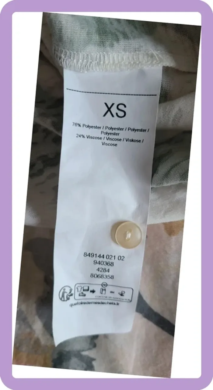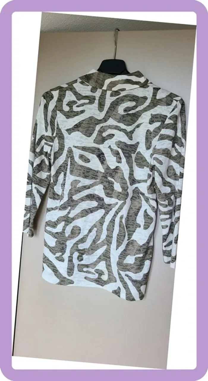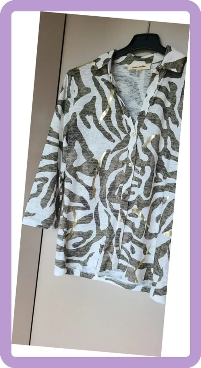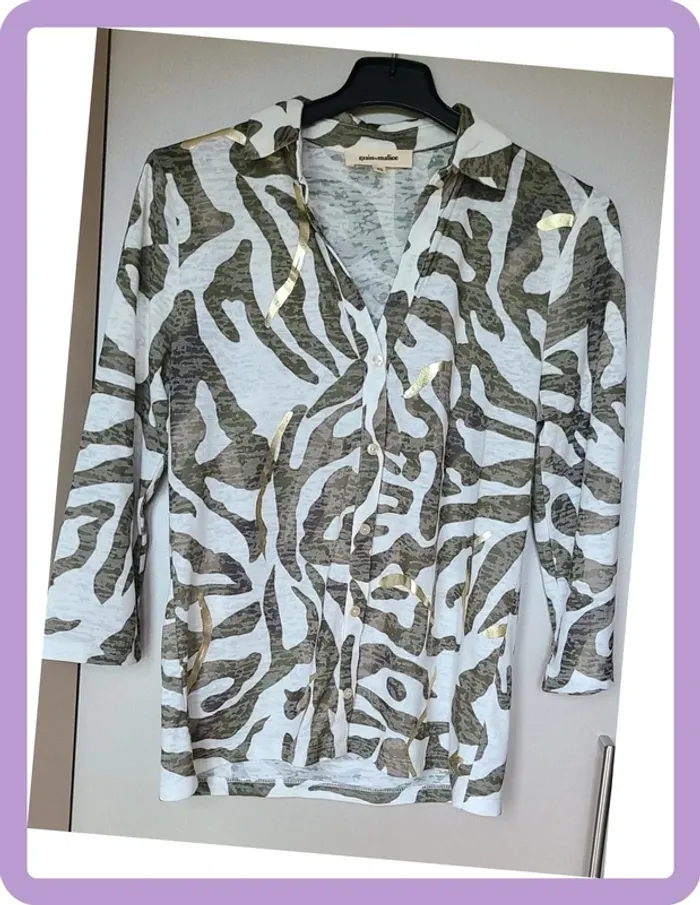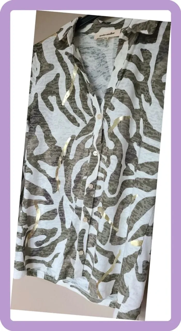 Joli T-shirt manches 3/4 Col ouvert Boutons trompe l'œil (ne s'ouvrent pas) Effet zébré avec détails argentés Acheté 19€ en mai 2024