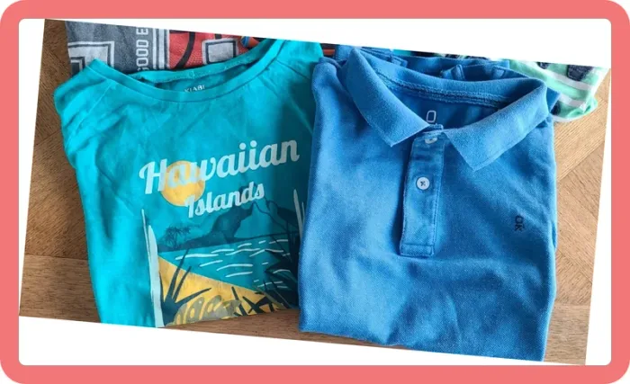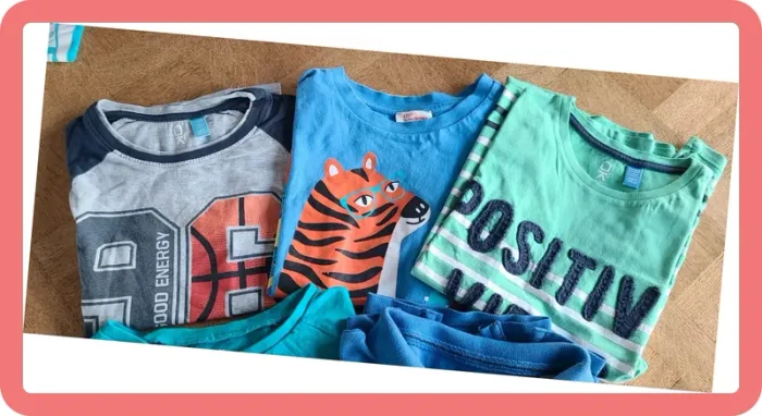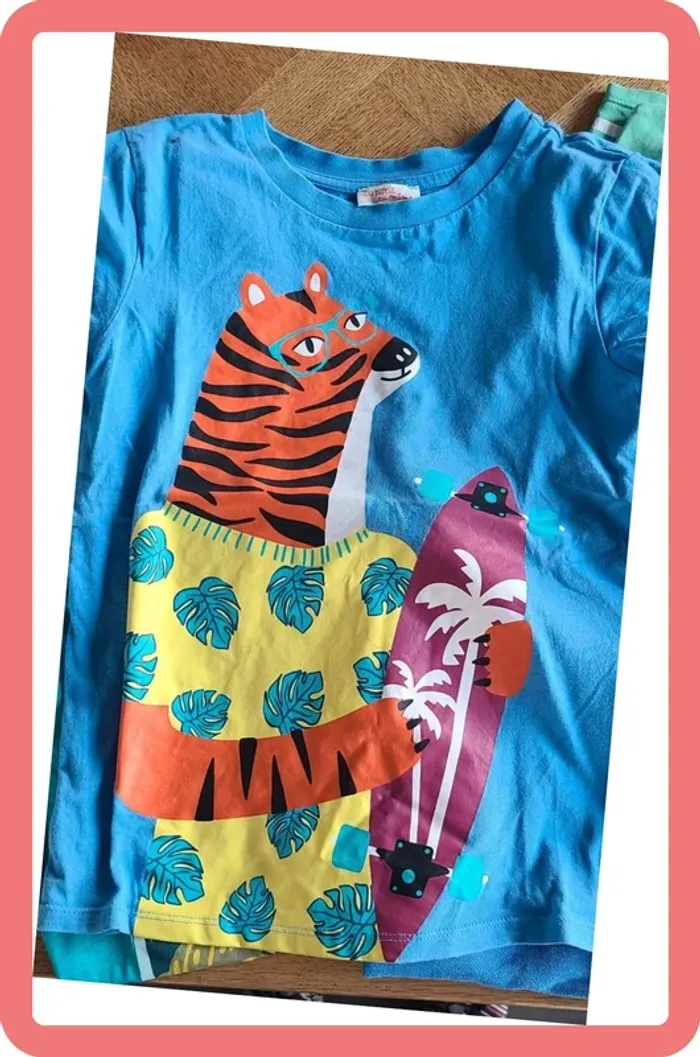 3 t-shirts Okaidi 1 t-shirt DPAM 1 t-shirt Kiabi 2 petits trous sur la manches du t-shirt vert