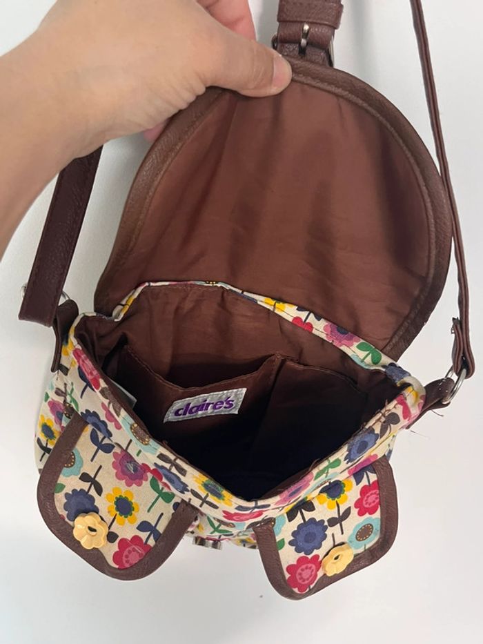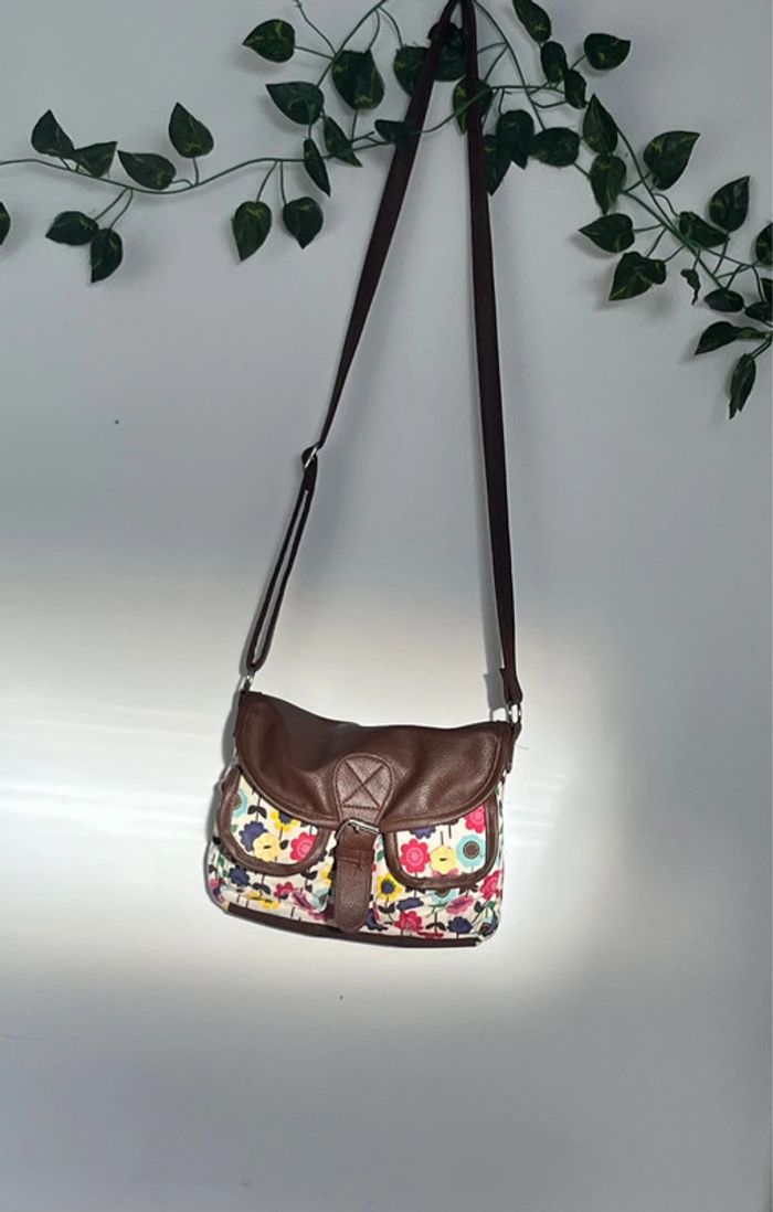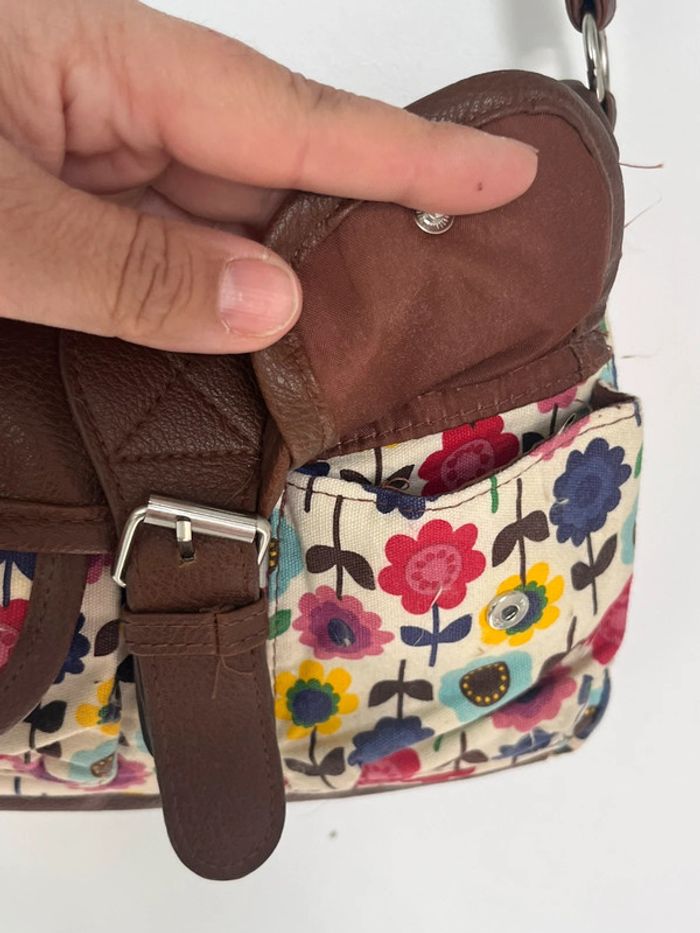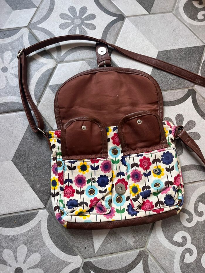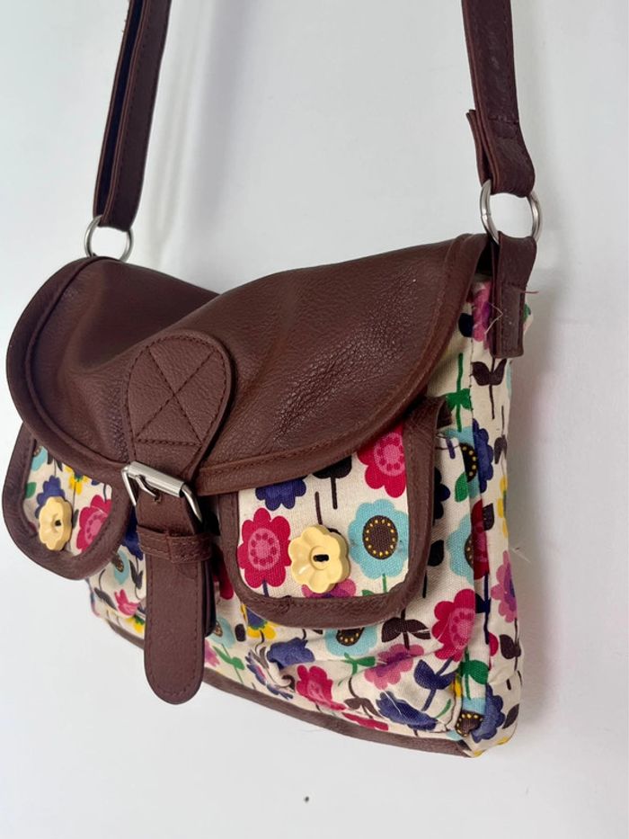sac rétro en bandoulière deux matières , un rabat et une lanière en similicuir marron chocolat 🍫 imprimée de fleurs colorées.un style printanier. Deux poches extérieures à l’avant, chacune fermée par un bouton en forme de fleur jaune, 🌼 qui ajoutent une touche de charme enfantin. La fermeture principale est assurée par une boucle en métal argenté et une lanière assortie au rabat. #sacretro #sacvintage #retrobag #springstyle Retro bag In shoulder two materials, a flap and a strap in chocolate brown imitation leather 🍫 printed with colored flowers. a spring style. Two external pockets at the front, each closed by a button in the shape of a yellow flower, 🌼 which add a touch of childish charm. The main closure is provided by a silver metal buckle and a strap matching the flap.