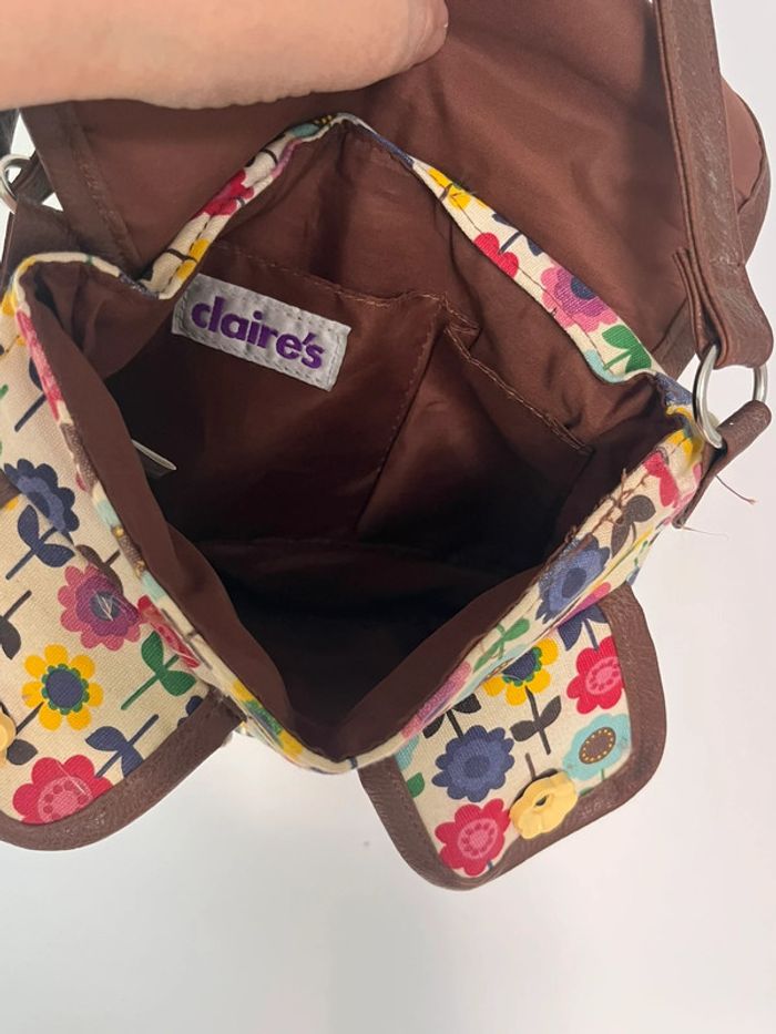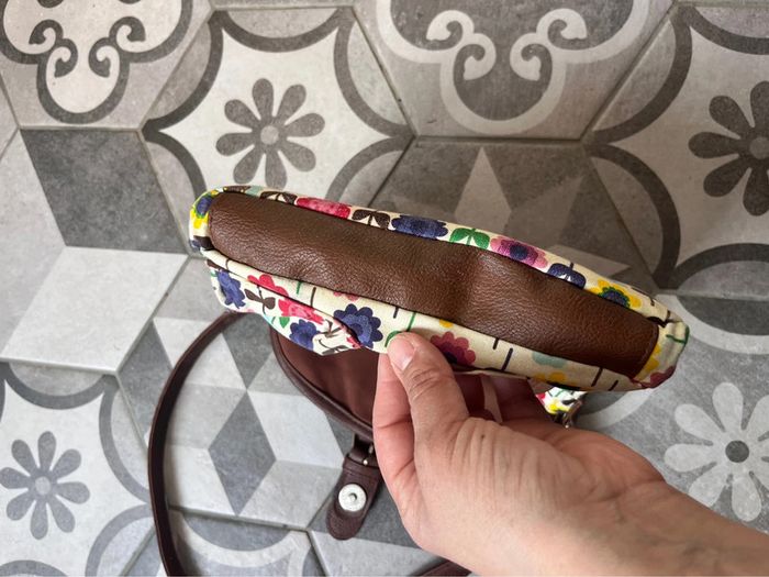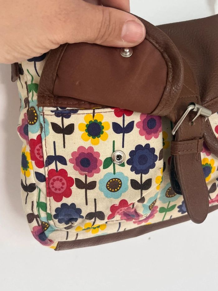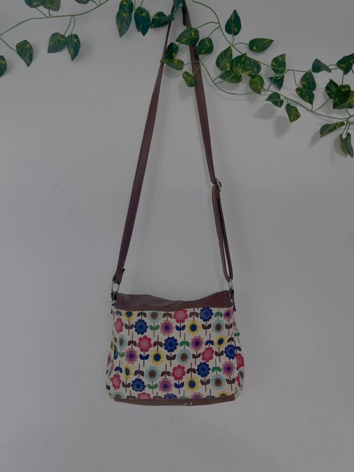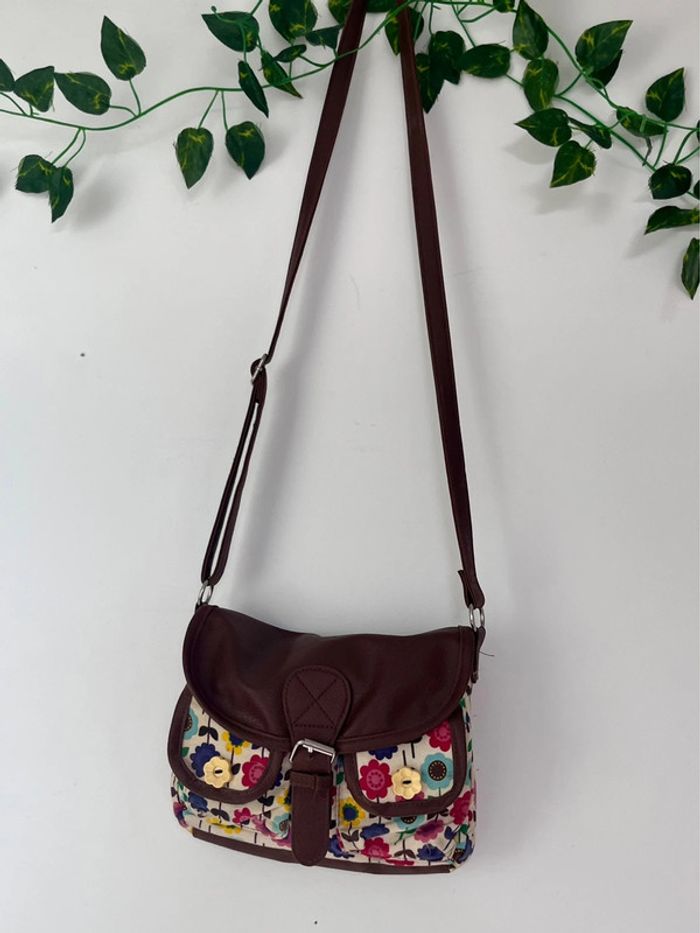 sac rétro en bandoulière deux matières , un rabat et une lanière en similicuir marron chocolat 🍫 imprimée de fleurs colorées.un style printanier. Deux poches extérieures à l’avant, chacune fermée par un bouton en forme de fleur jaune, 🌼 qui ajoutent une touche de charme enfantin. La fermeture principale est assurée par une boucle en métal argenté et une lanière assortie au rabat. #sacretro #sacvintage #retrobag #springstyle Retro bag In shoulder two materials, a flap and a strap in chocolate brown imitation leather 🍫 printed with colored flowers. a spring style. Two external pockets at the front, each closed by a button in the shape of a yellow flower, 🌼 which add a touch of childish charm. The main closure is provided by a silver metal buckle and a strap matching the flap.