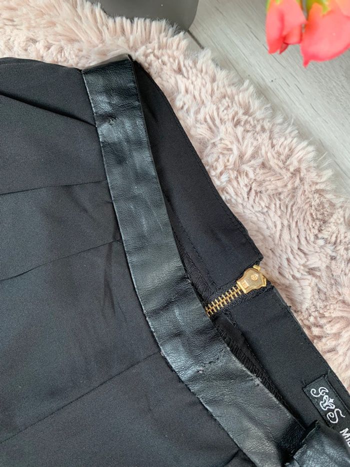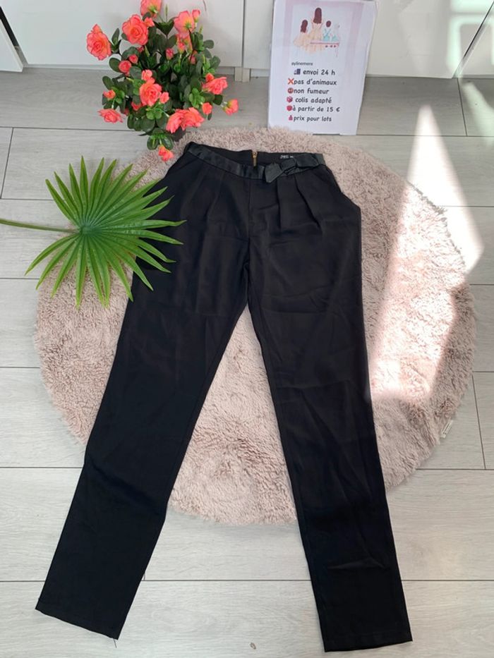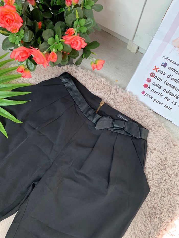 Pantalon fluide de tailleur agréable avec ceinture intégrée similicuir noeud et fermeture éclair doré à l’arrière. 96%polyester 4% spandex