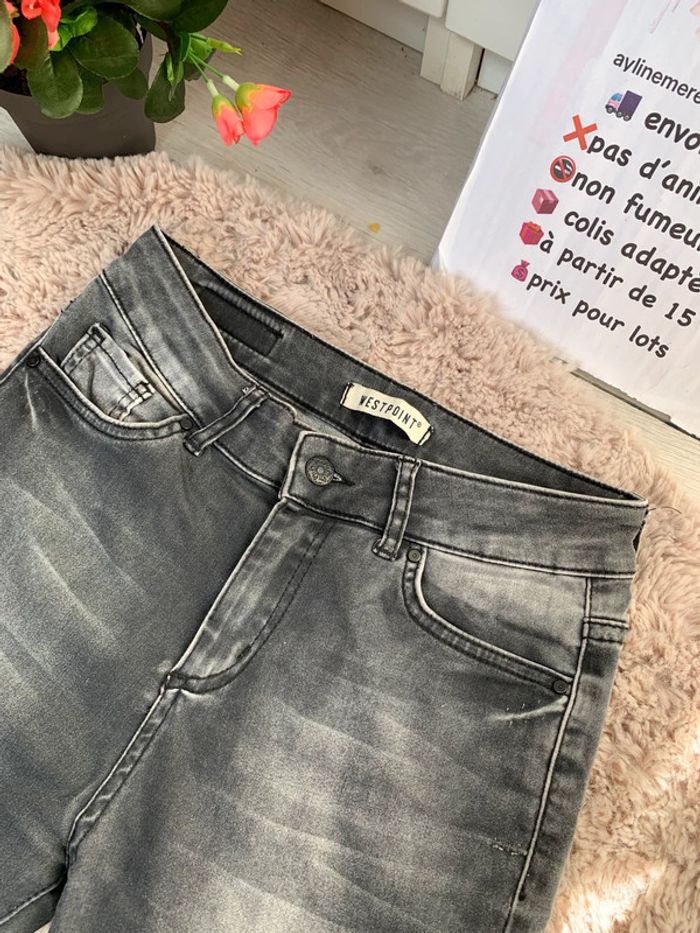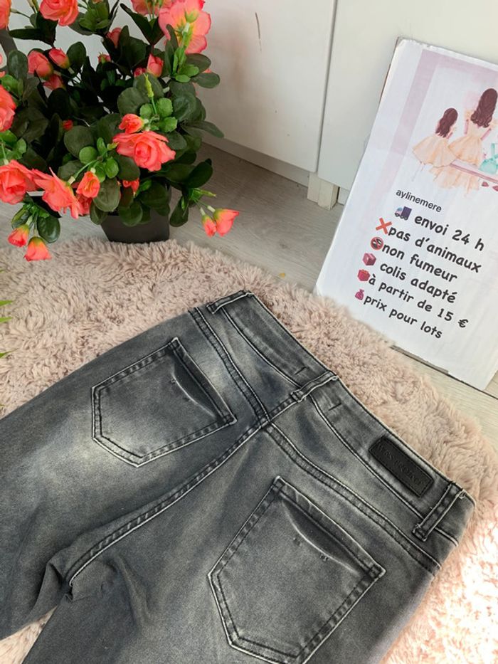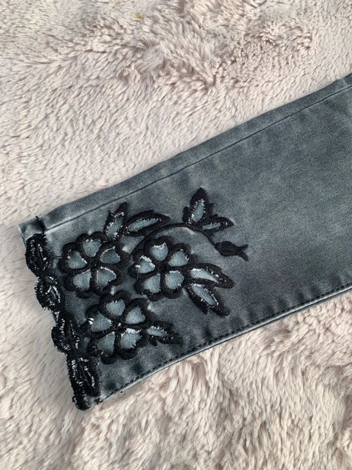 Jean gris foncé un peu délavé avec des poches et broderie en bas du mollet