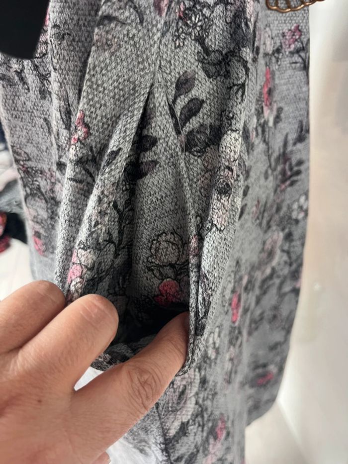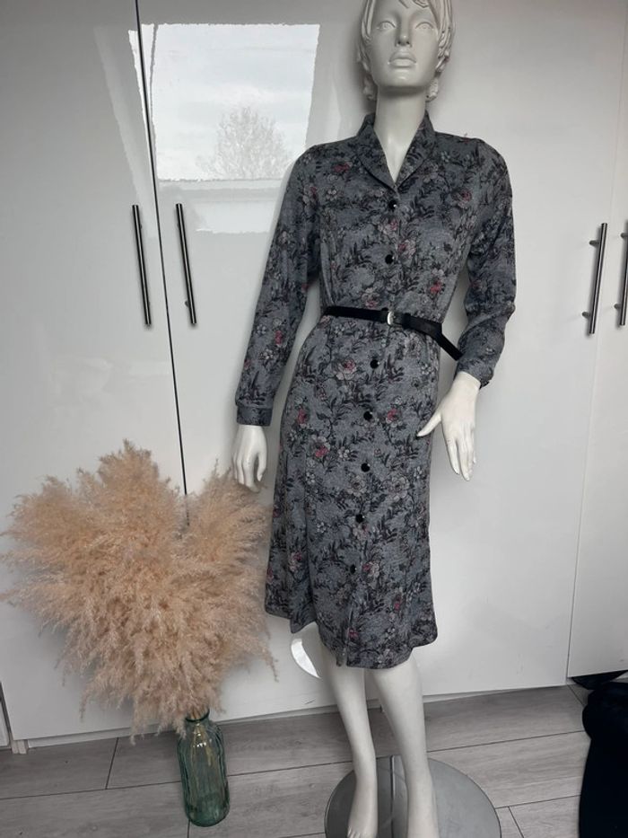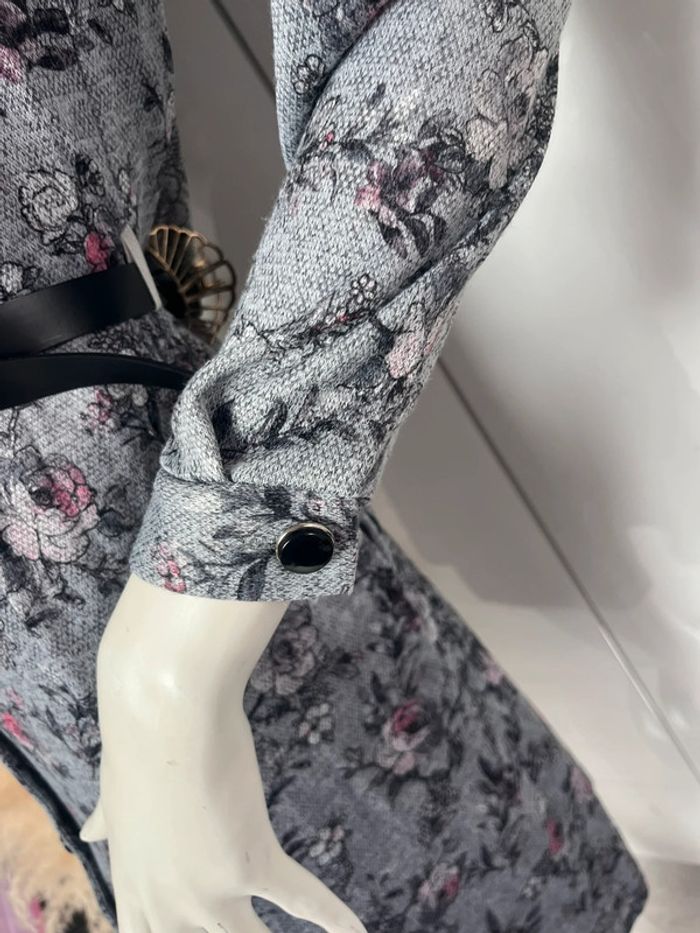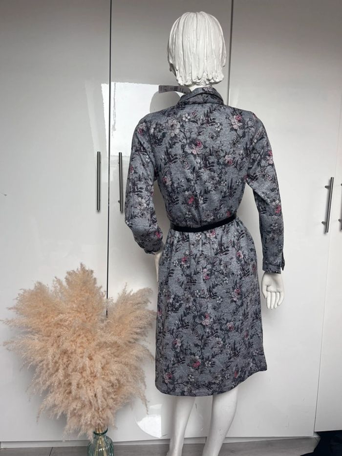 Marque : Damart Catégorie : Robe mi-longue femme Couleur : gris Coupe : Cintrée Fermeture : Boutonnée sur le devant Poches : Oui Col : Châle Imprimé : Fleurs