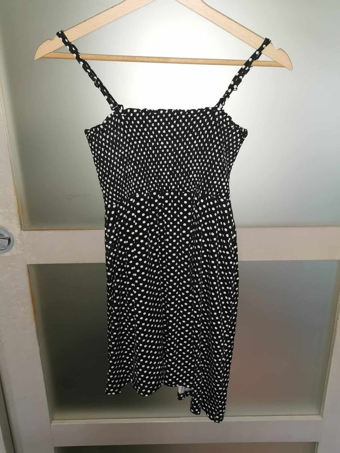 Jolie tunique longue à bretelles amovibles ( idéal allaitement ), noire à pois blancs , taille S , bas asymétrique , excellent état . N'hésitez pas à me demander d'autres photos ou infos complémentaires et à consulter mes autres ventes .