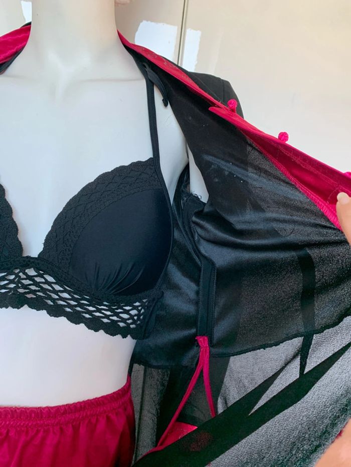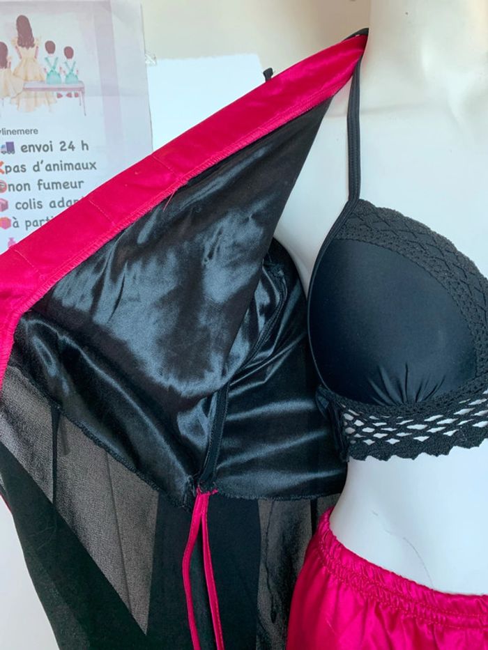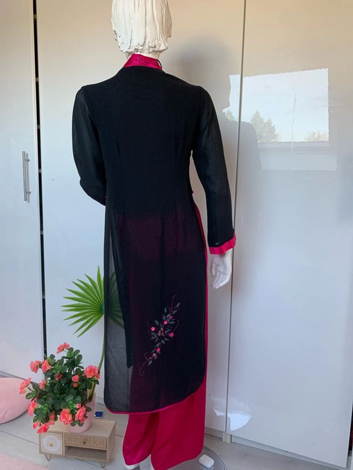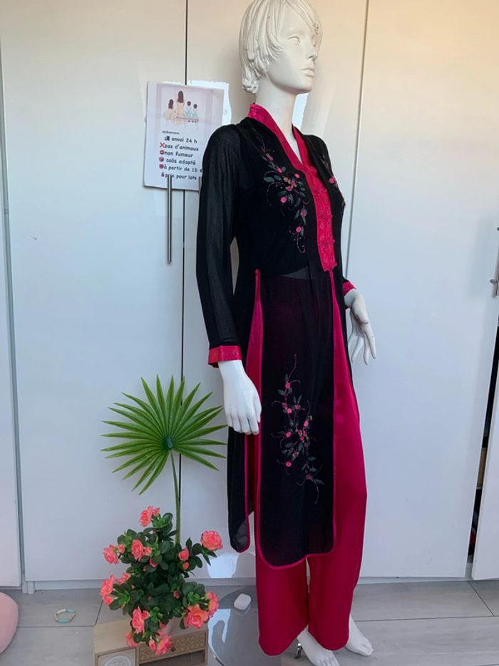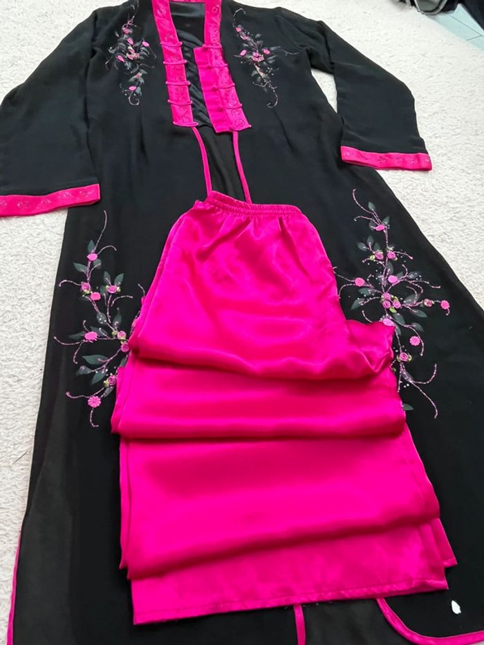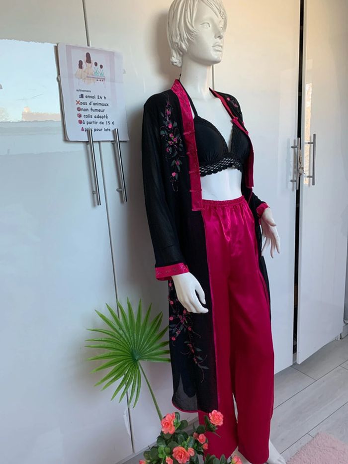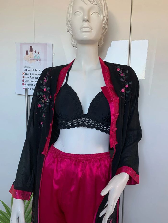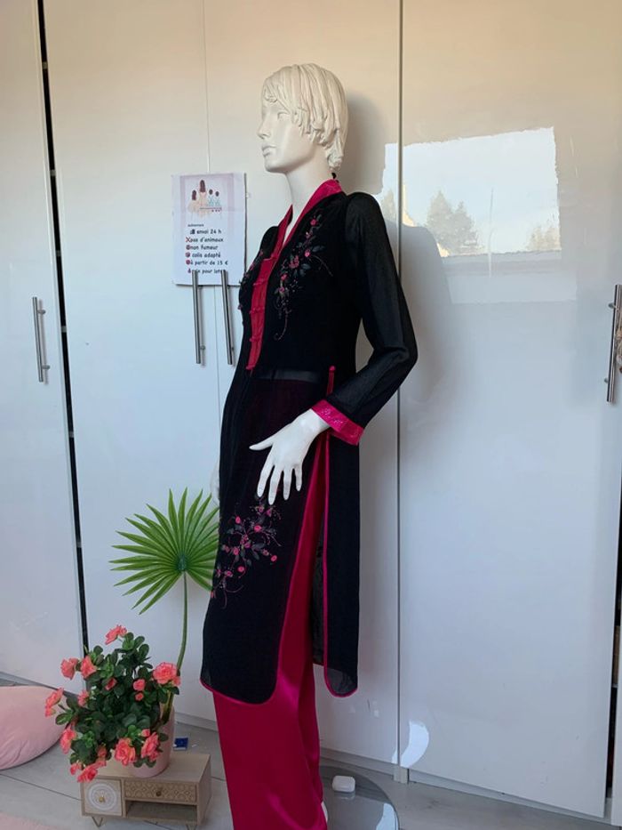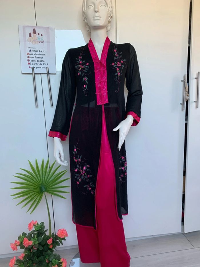 Ensemble pantalon tunique inspiration asiatique 👘 japonais Noir et rose fushia Satin , polyester,viscose #kimonofemme #soiréetheme #ensemblefetes #