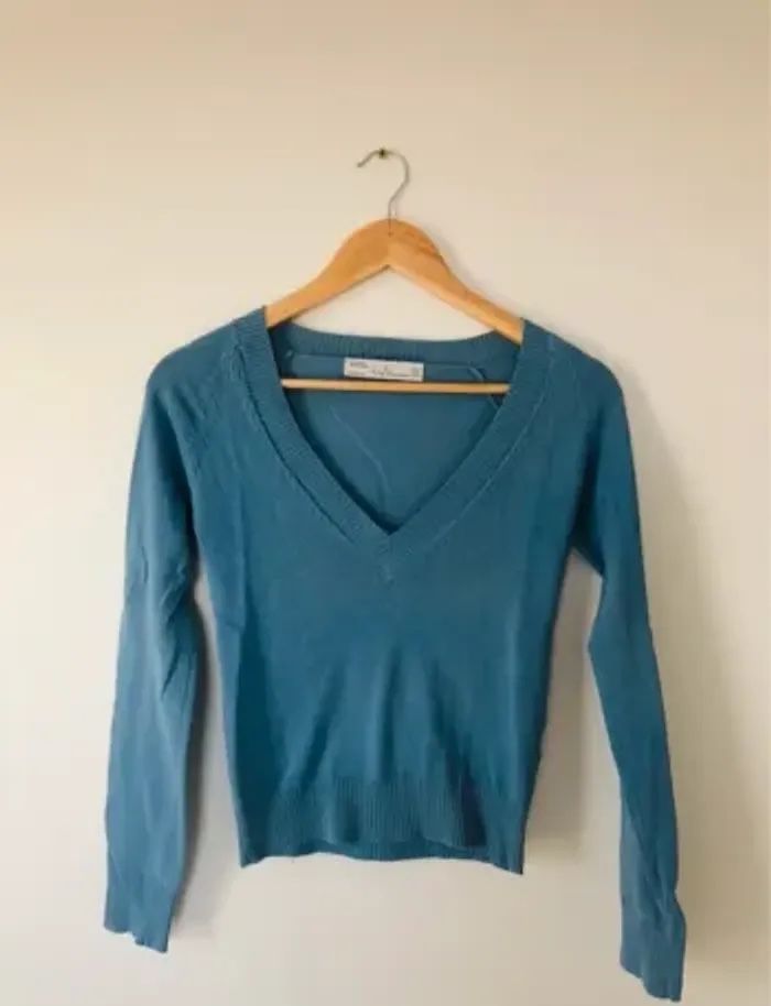 Pull bleu femme S 36 col v petit tricot Zara trafaluc - photo numéro 1