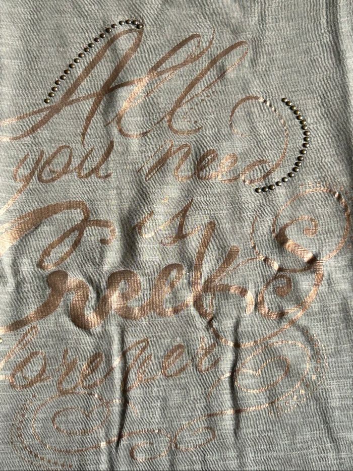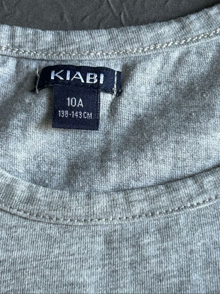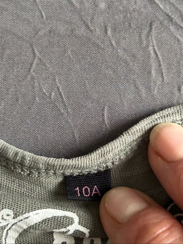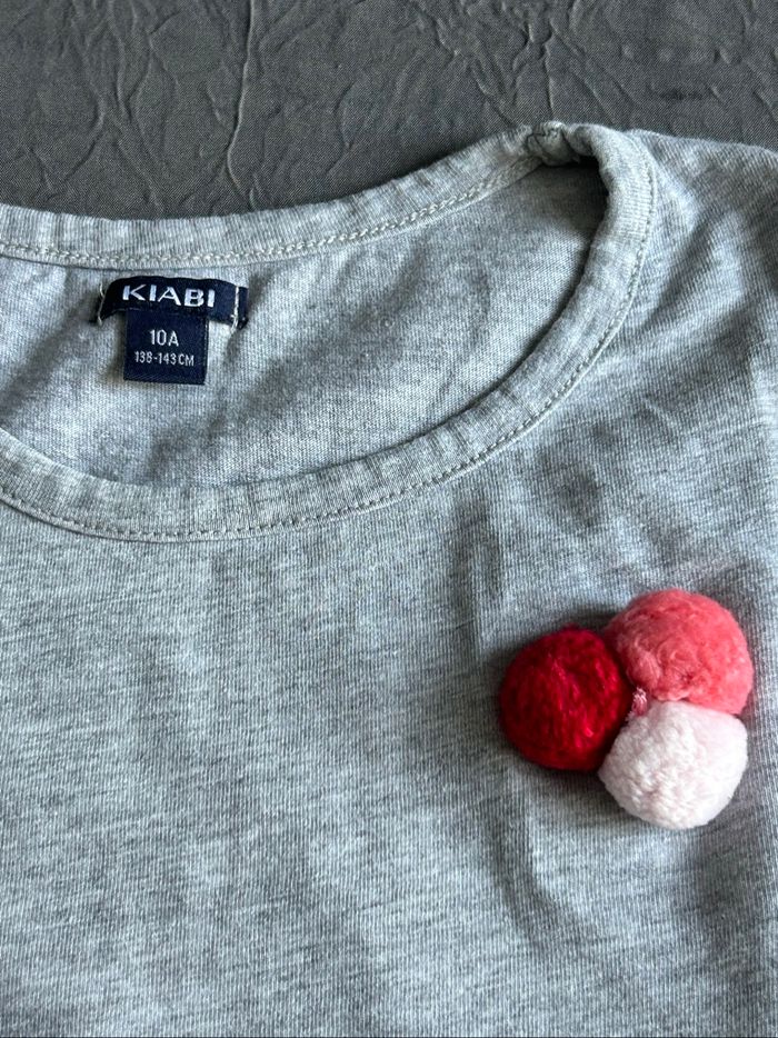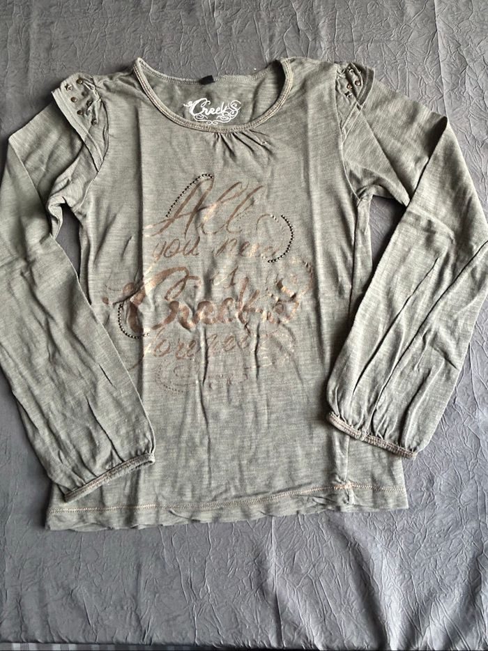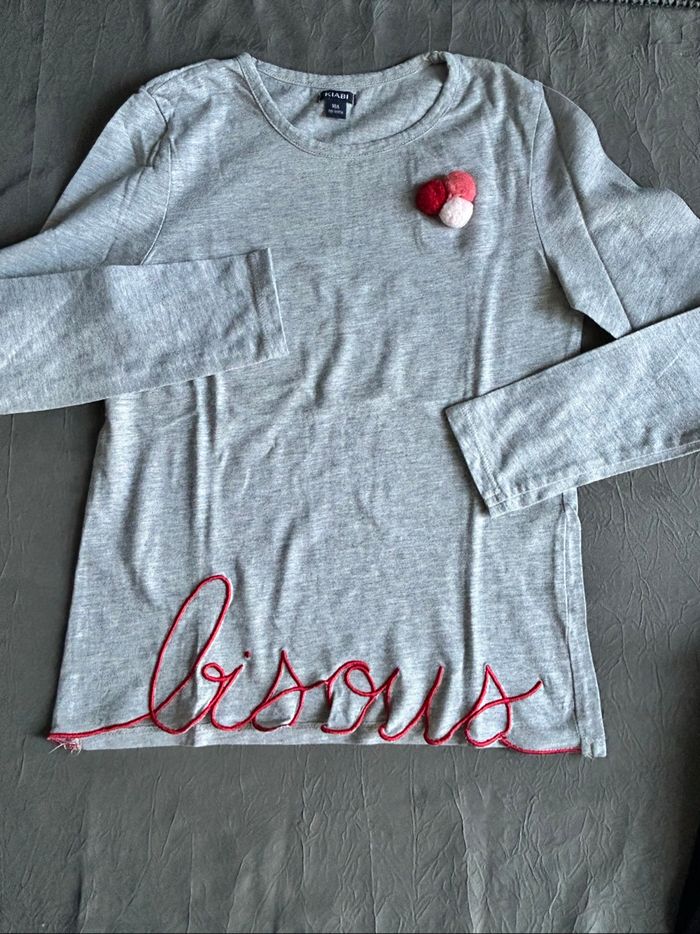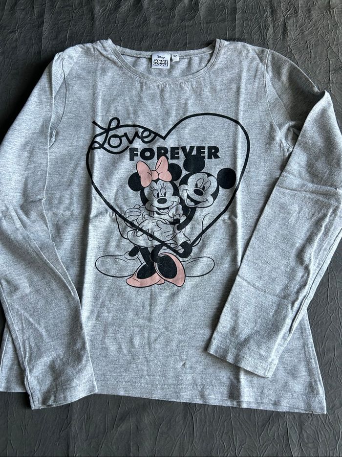 lot de 3 t-shirts manches longues pour fille. Taille 10 ans. -1 gris avec motif Minnie, de la marque « Disney ». -1 gris avec écriture « bisous » découpée et brodée en bas devant et déco pompons sur la poitrine gauche. De la marque « Kiabi ». -1 kaki avec écritures doré devant et déco cloutée sur manchettes épaules. De la marque « Creeks ». En excellent état.