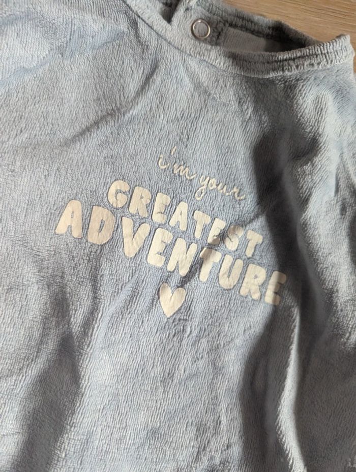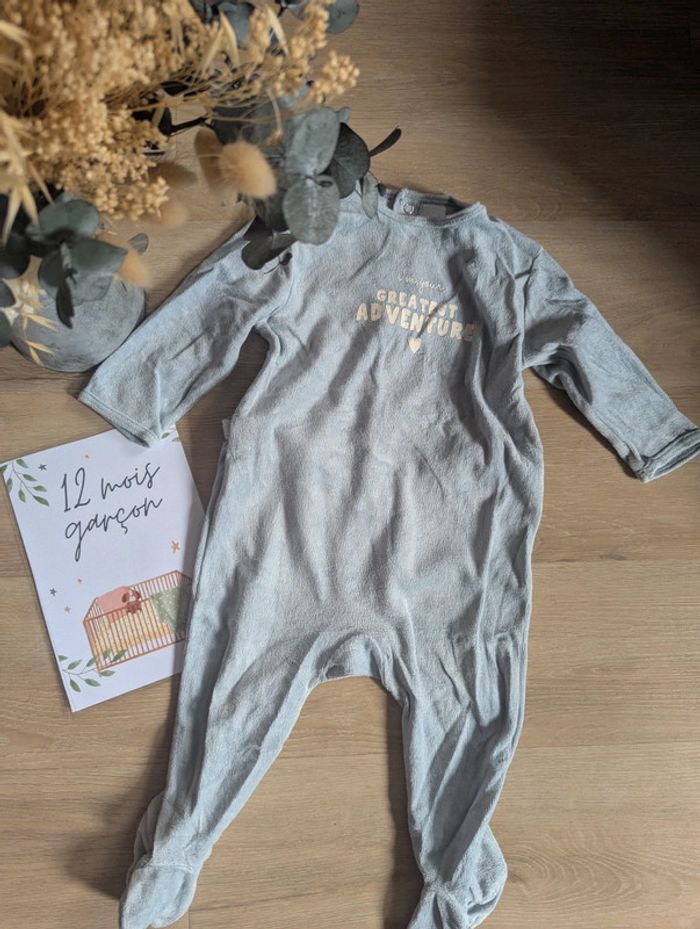 Pyjama 1 pièce, en velours Taille : 12 mois Marque : Kiabi État : très bon état Couleur : Bleu clair. Maison non fumeur et sans animaux. #12moisgarconnonostory Envoi rapide et soigné. Réduction sur les lots 😉