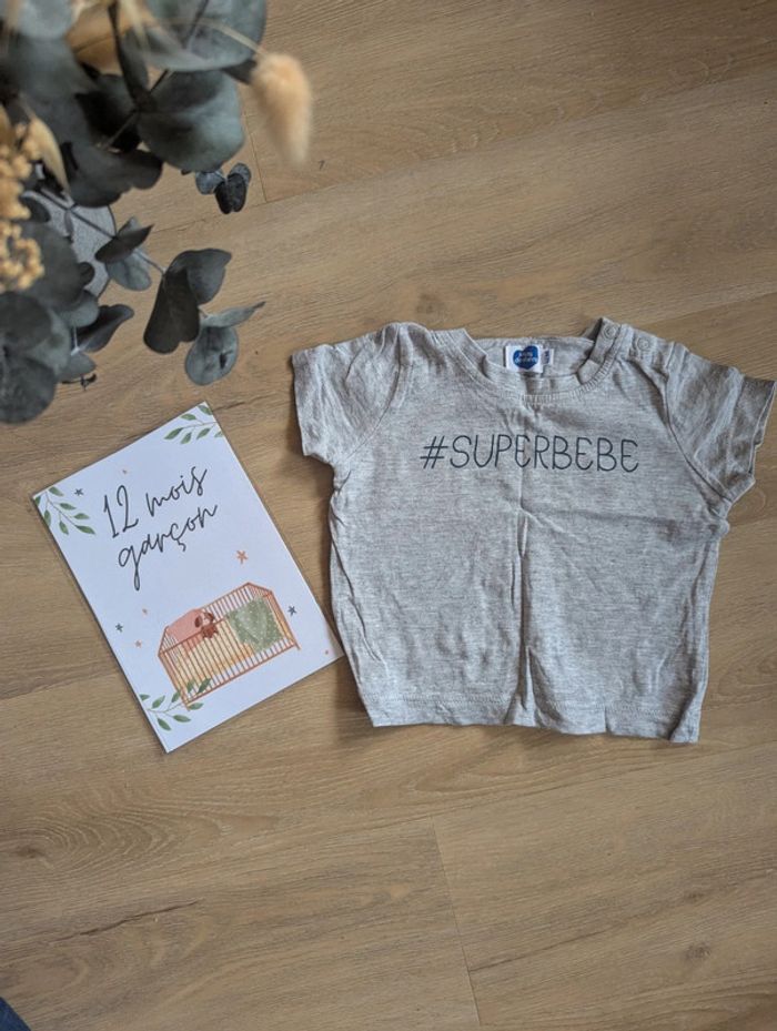 #Superbebe. T-shirt gris manches courtes. 12 mois. Bon état. Marque Mots d'enfants. Maison non fumeur et sans animaux. #12moisgarconnonostory Envoi rapide et soigné. Réduction sur les lots 😉